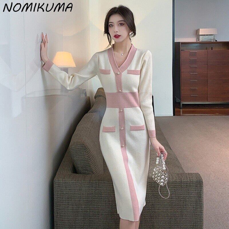 Nomikuma 秋冬 V ネックレディセーター Vestidos ローブストライプコントラストカラーニット女性ドレス オータム 秋物 ウィンター 冬物 Vネック kor94133581418