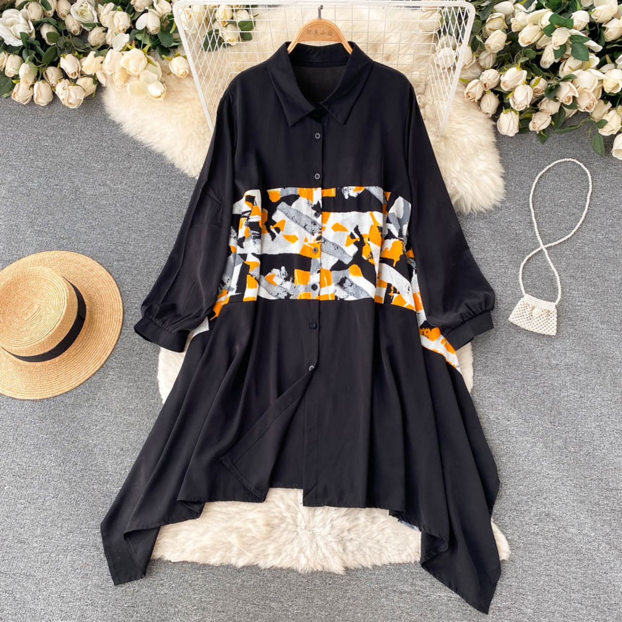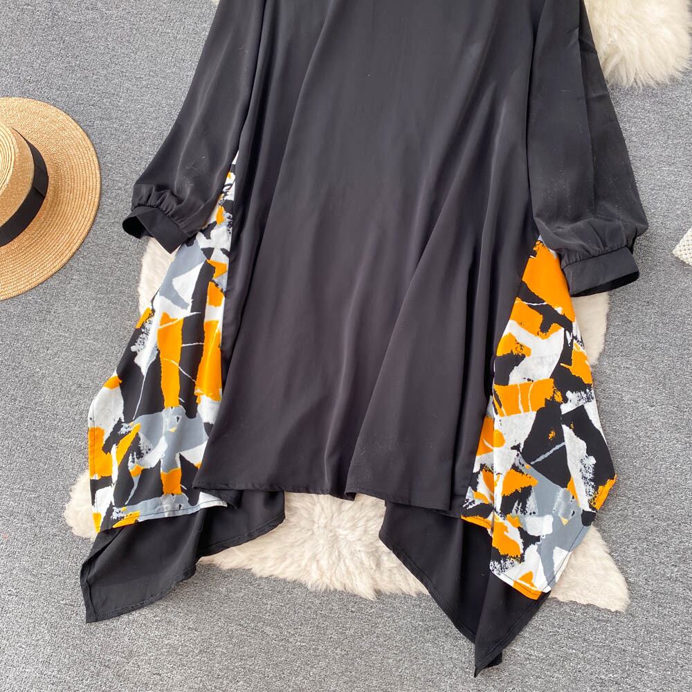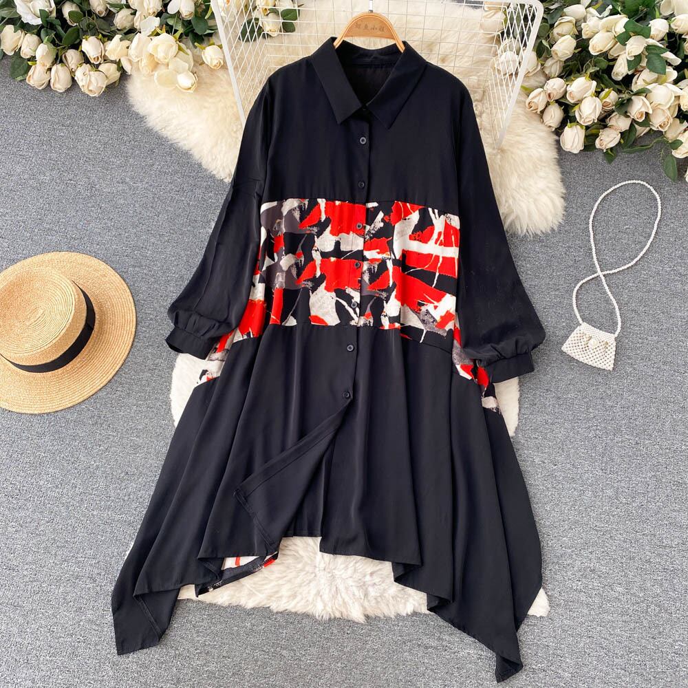 Nomikuma 印刷パッチワークブラウス不規則なドレス因果長袖ターンダウン襟秋の女性のドレス ロング オータム 秋物 kor3846075698