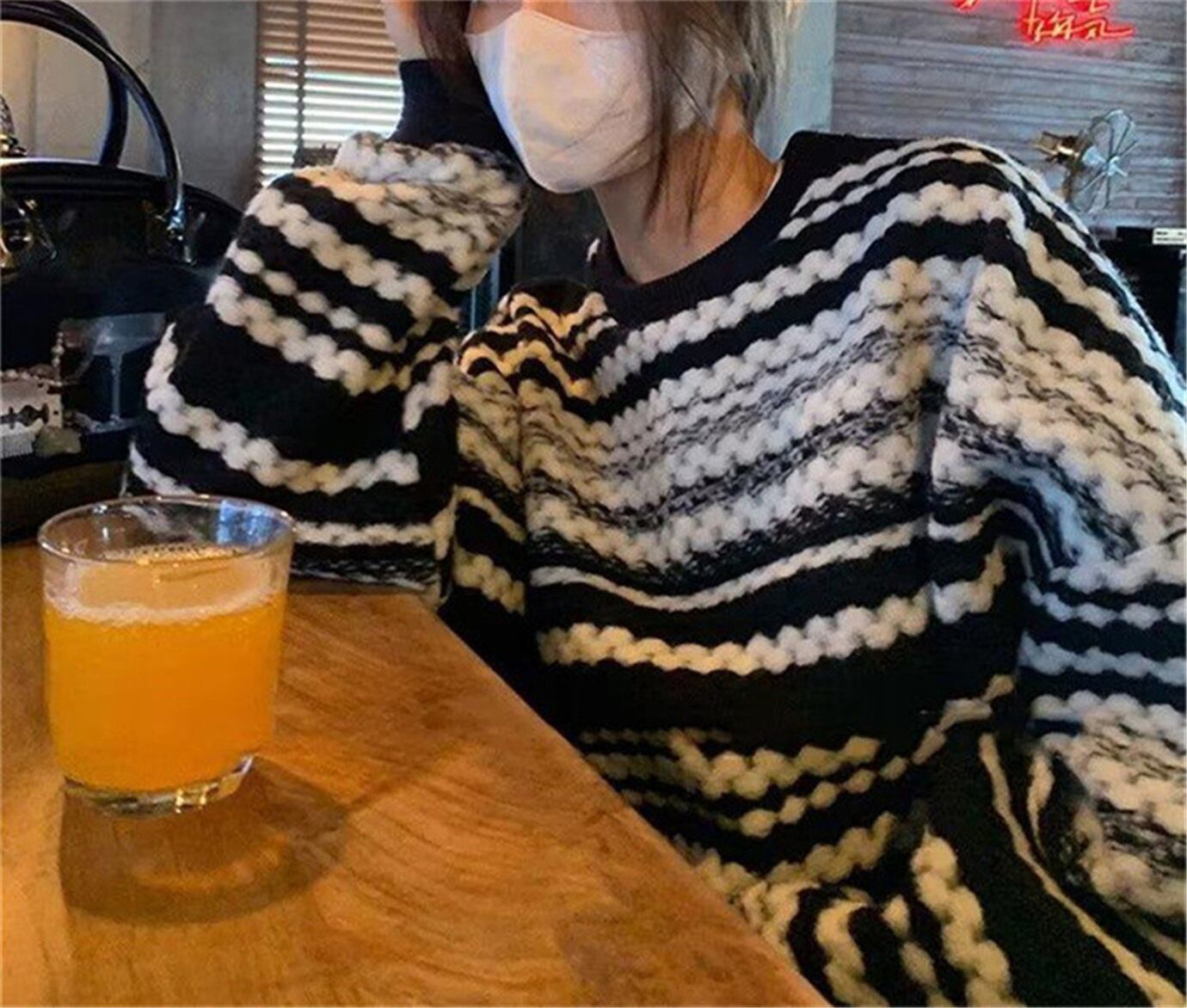 ノミクマ 因果 コントラストカラー ウェーブ ストライプ セーター 長袖 Oネック プルオーバー ニット 2022秋冬 プルトップ ジャンパー ロング オータム 秋物 ウィンター 冬物 kor60107270753