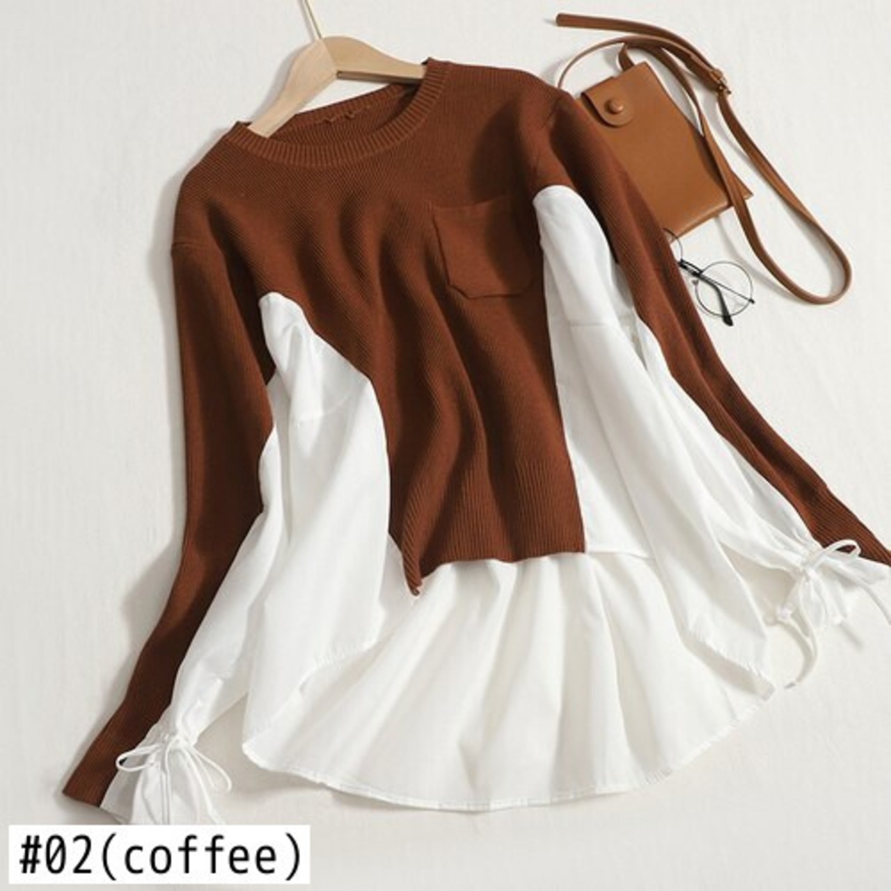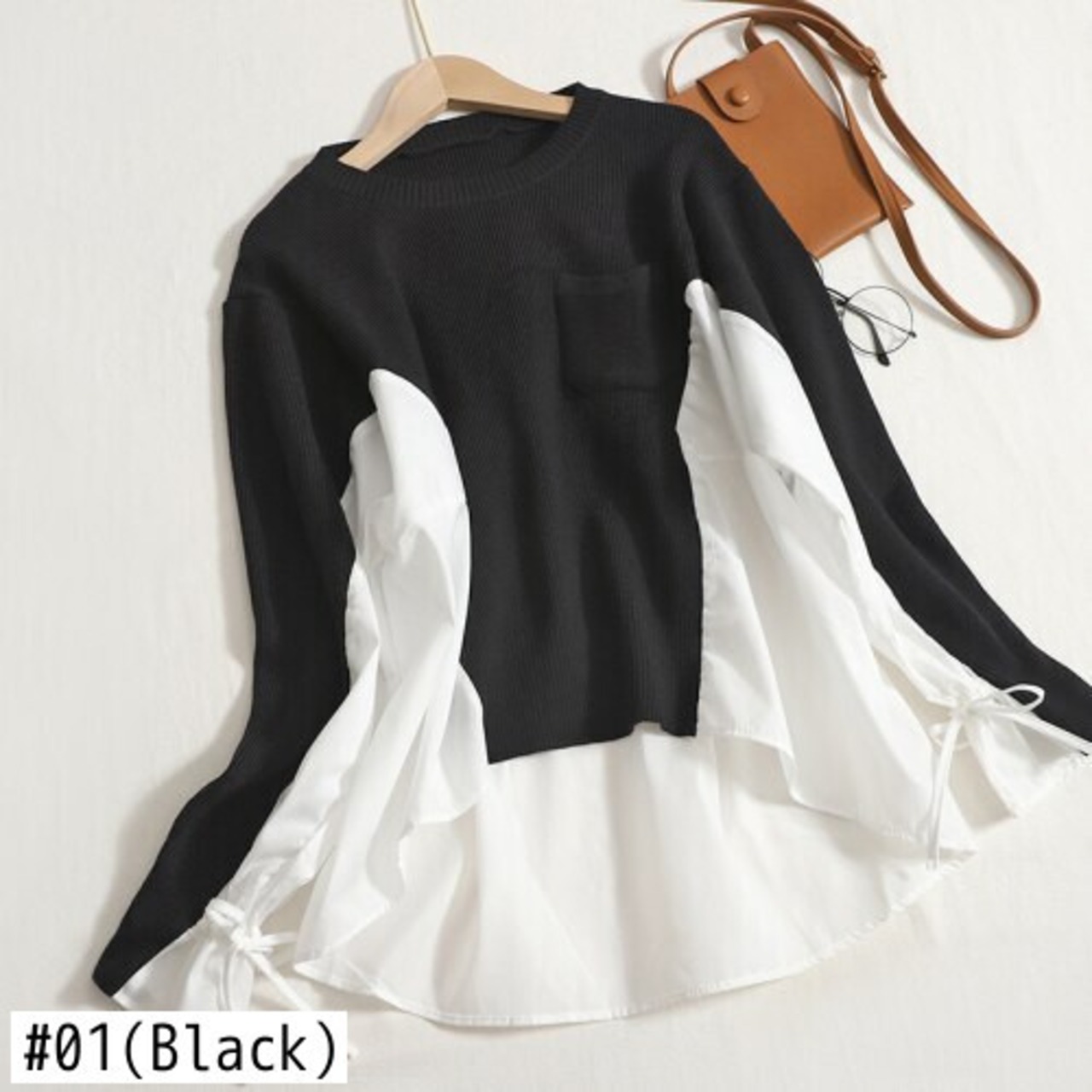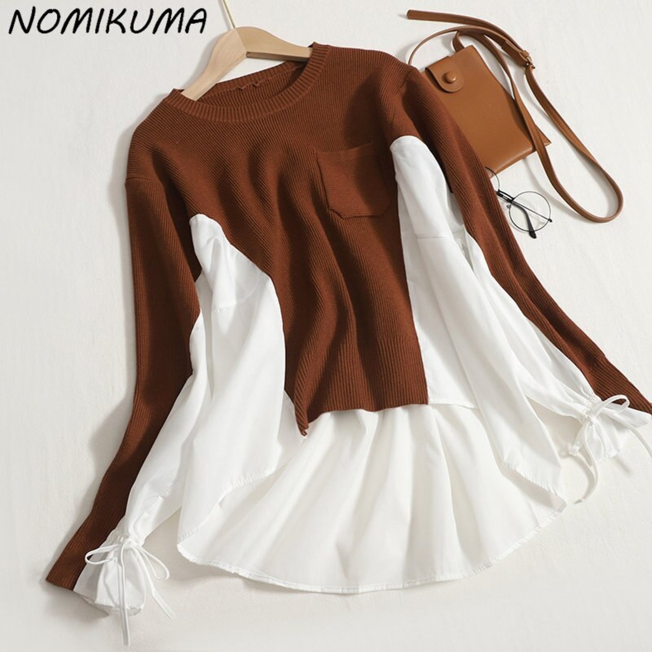 Nomikuma Bouse パッチワークニットトップス因果レースアップ長袖 O ネック女性セーター 2022 秋冬プル ロング オータム 秋物 ウィンター 冬物 Oネック kor5280208051