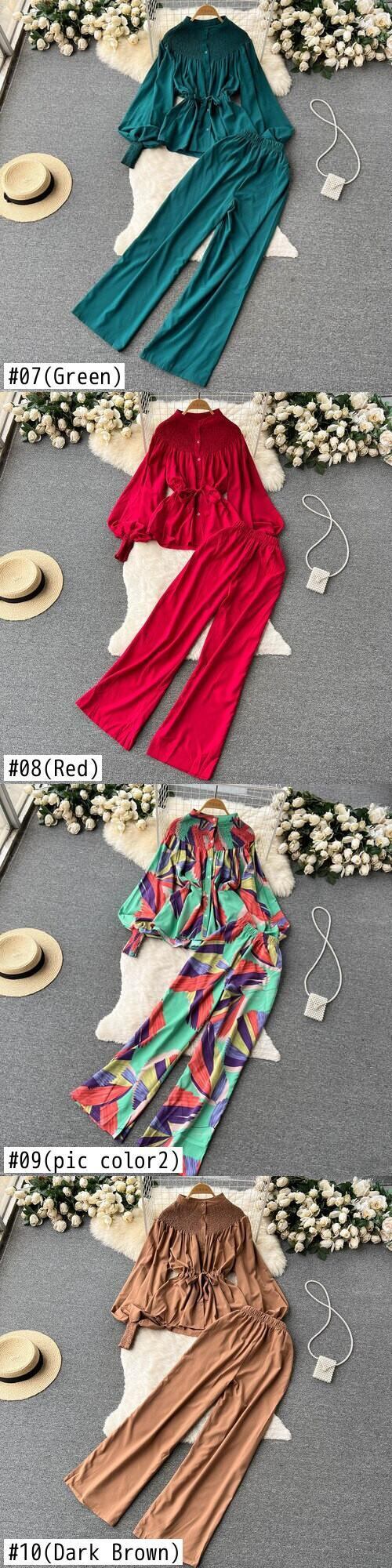 Nomikuma 印刷セット女性パフスリーブレースアップフリルブラウストップス + ウエストワイドレッグロングパンツ 2022 衣装 ワイドパンツ kor92066924143