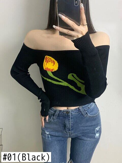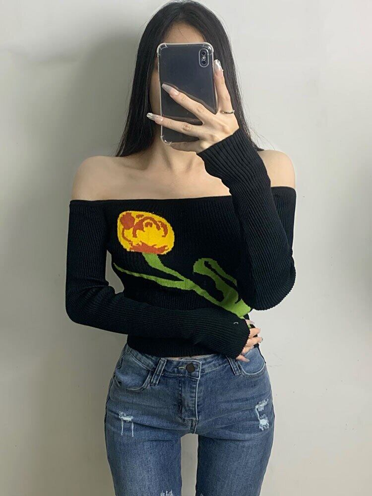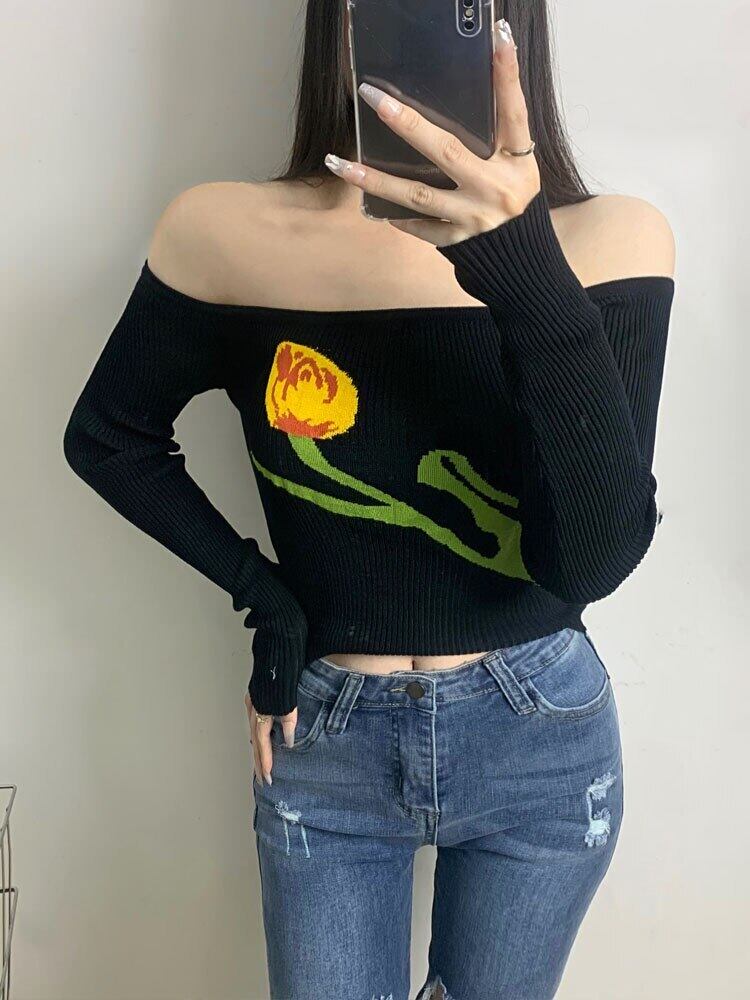 Nomikuma 秋 2022 オフショルダーニット女性花長袖スリムセクシーなショートニットセータートップス ロング オータム 秋物 フラワーデザイン kor21389367567