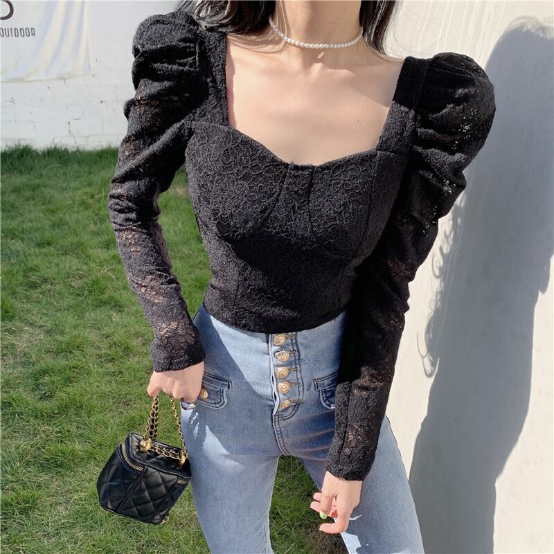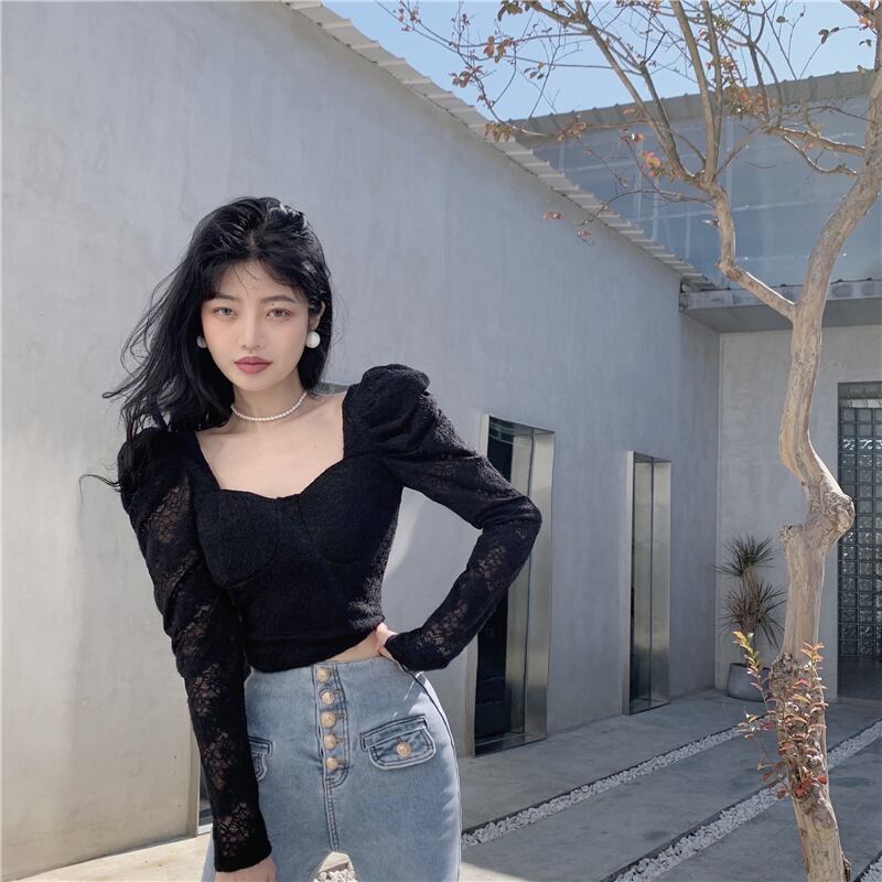Nomikuma セクシー スクエア カラー ショート レース シャツ 春 秋 シック スリム レディース ブラウス デ スプリング 春物 オータム 秋物 スクウェア kor48528791526