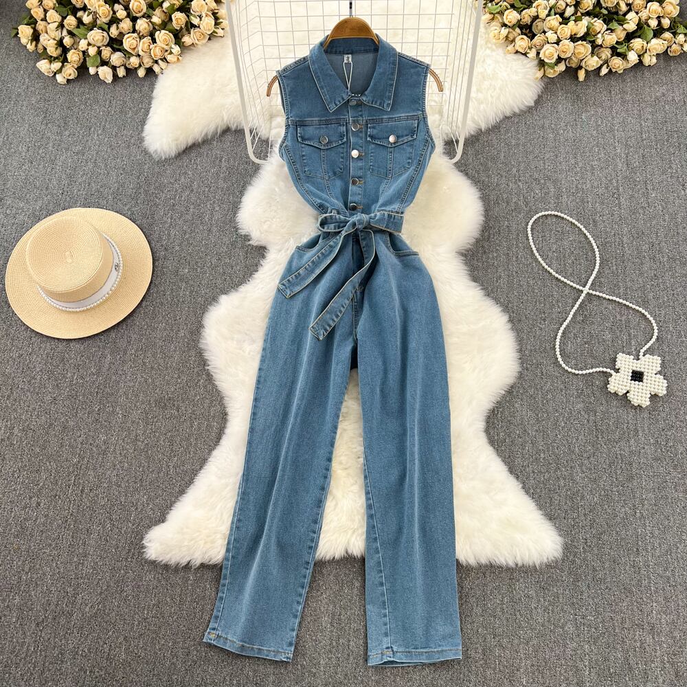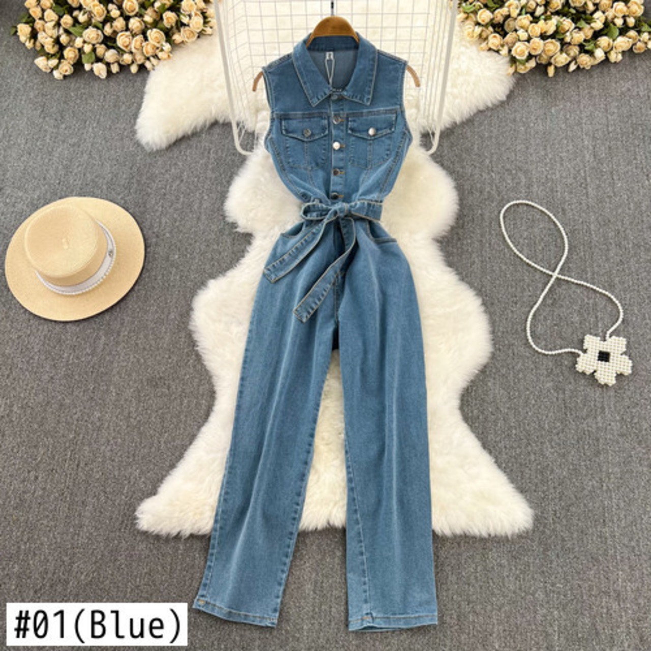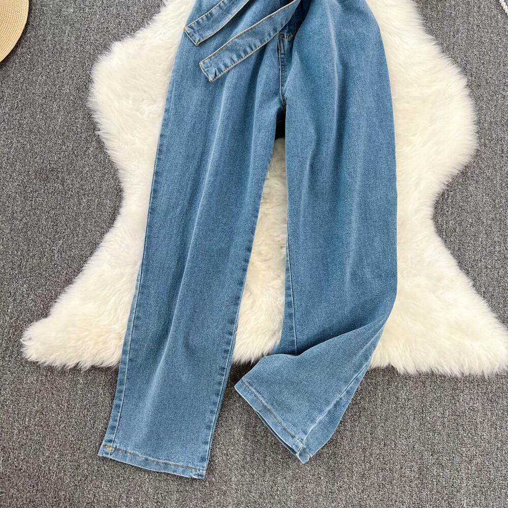 Nomikuma ノースリーブ徳民ジャンプスーツ女性ロンパース弓包帯スリムウエストストレートジーンズボディスーツ リボン kor87122570714