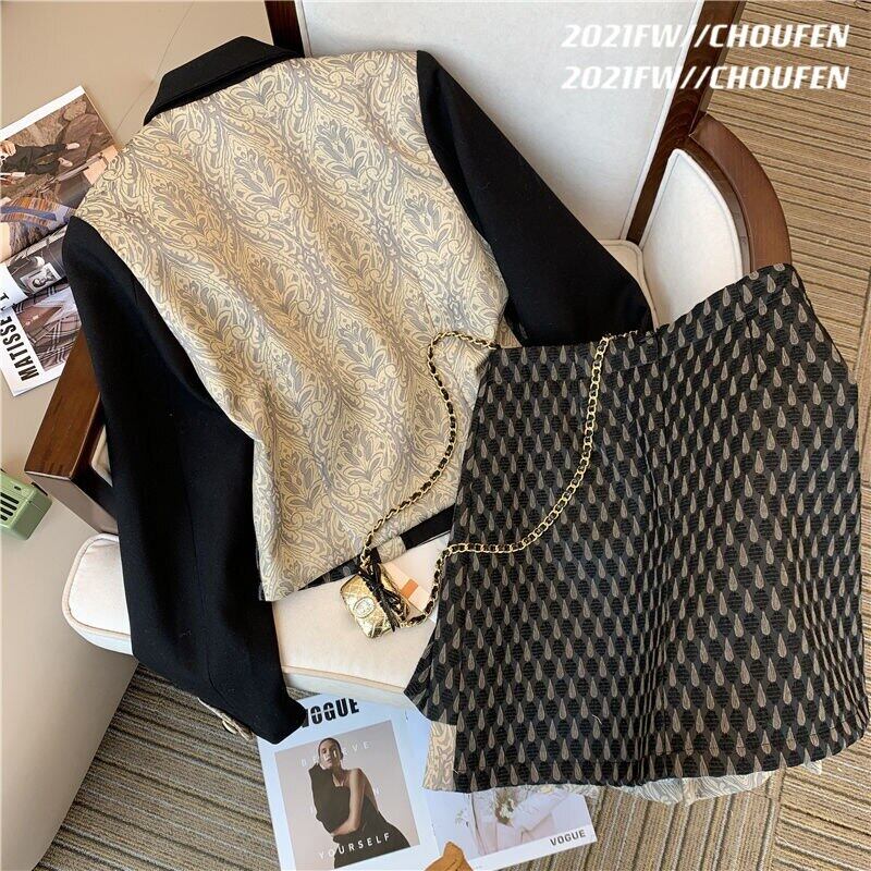ノミクマヒットカラープリントレディースセット長袖ダブルブレストターンダウンカラーコート+ウエストプリーツスカート ロング kor50299315441