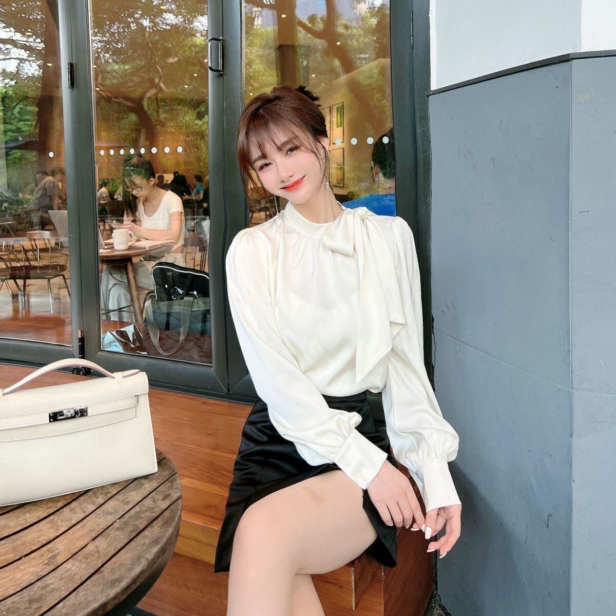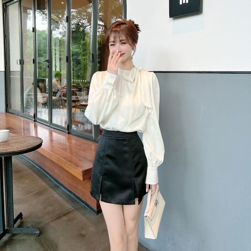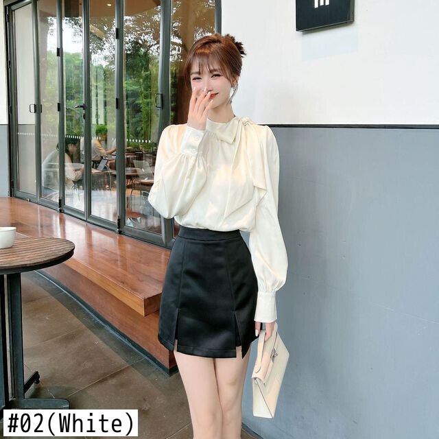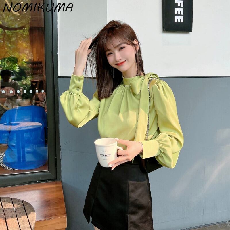 Nomikuma 春秋サテンブラウス弓包帯スタンドネックパフスリーブ女性シャツ Fahsion 固体デ リボン スプリング 春物 オータム 秋物 ソリッドカラー kor18044196648