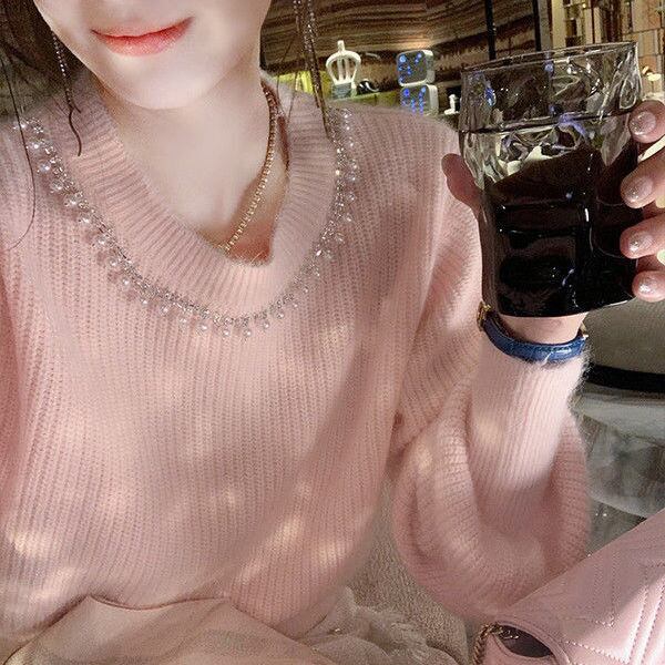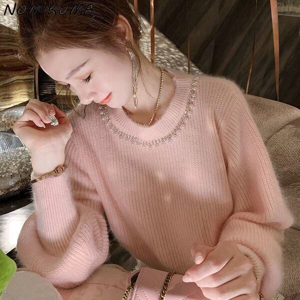 Nomikuma シックなビーズ O ネックプルオーバーニットトップス因果長袖女性セーター 2022 秋冬甘いニット ロング 大人ガーリー スウィート キュート カジュアル オータム 秋物 ウィンター 冬物 Oネック kor77290323690