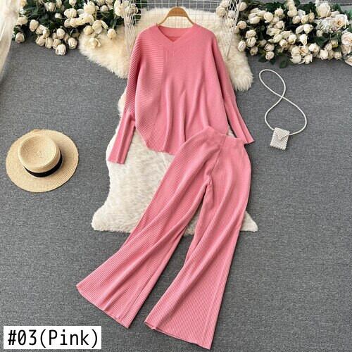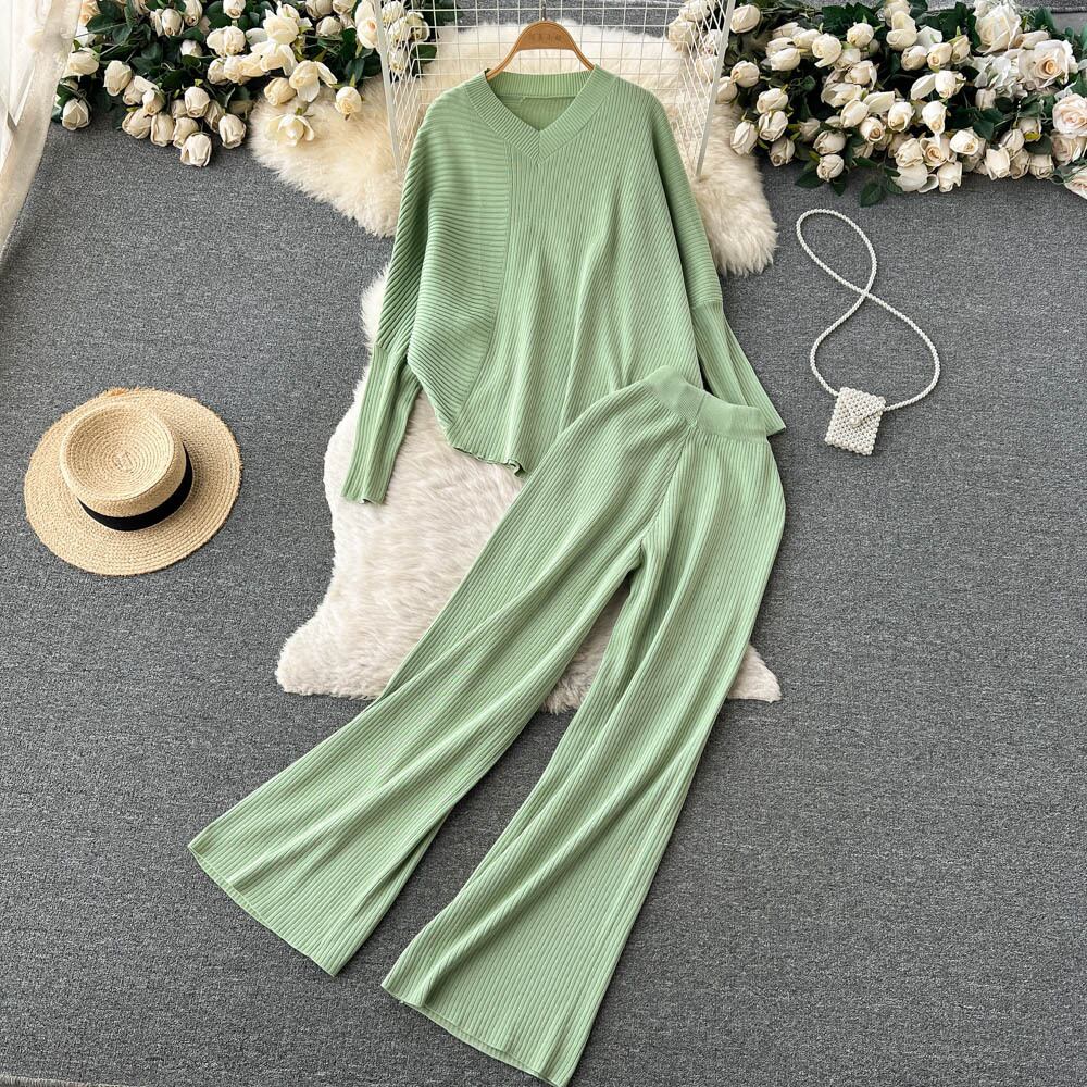 ノミクマ秋冬ニットロングパンツセットカジュアルVネックプルオーバーニットセーター+ウエストワイドレッグパンツ2022 2点セット オータム 秋物 ウィンター 冬物 ワイドパンツ kor89788346203