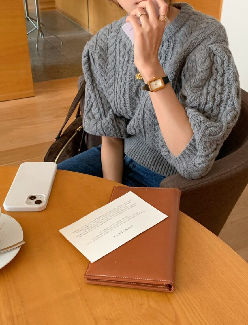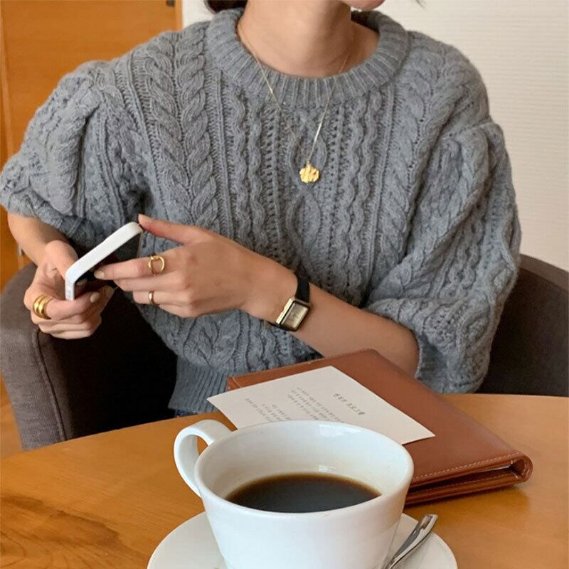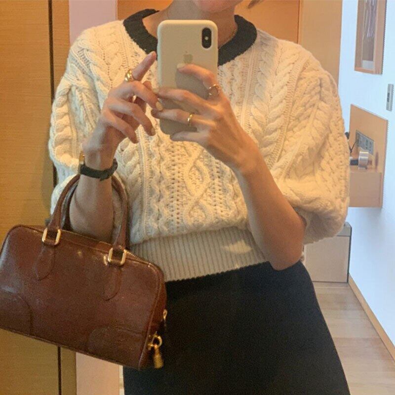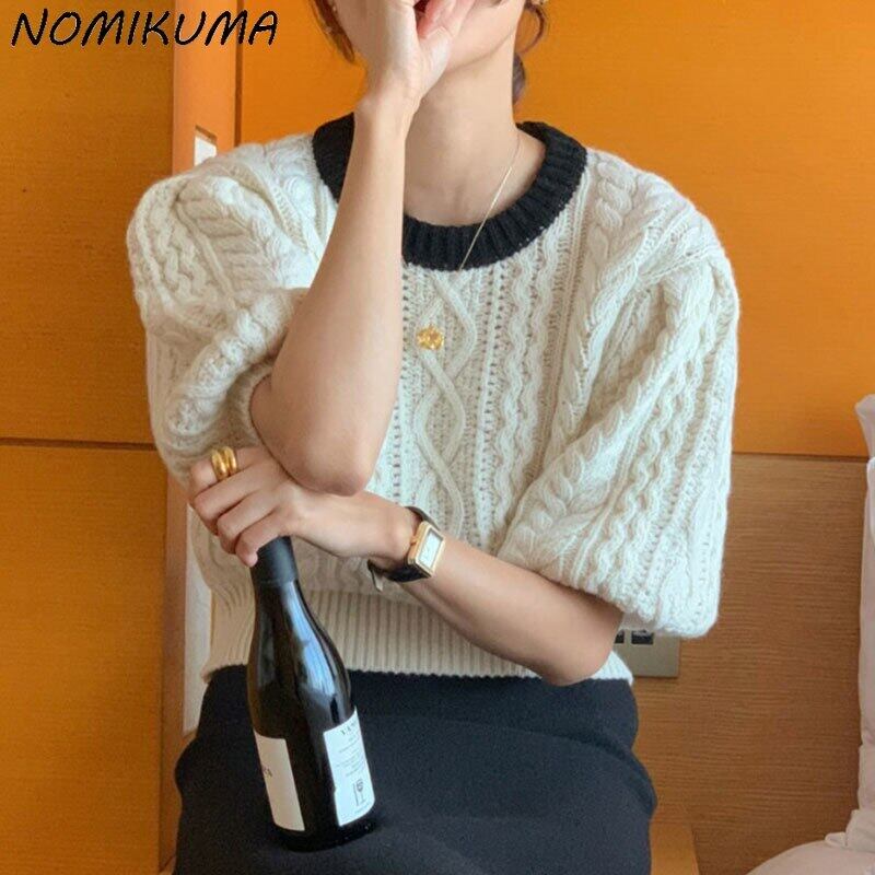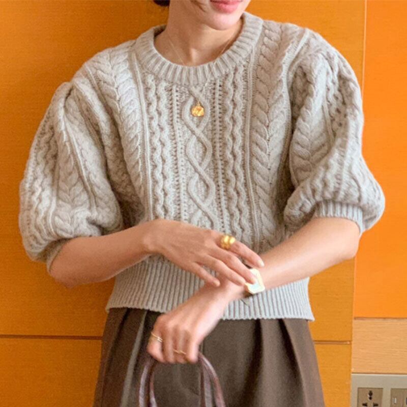 ノミクマ ヒットカラー Oネック ツイスト プルオーバー セーター カジュアル パフスリーブ 秋冬 ニット ショートプル オータム 秋物 ウィンター 冬物 kor96896474582
