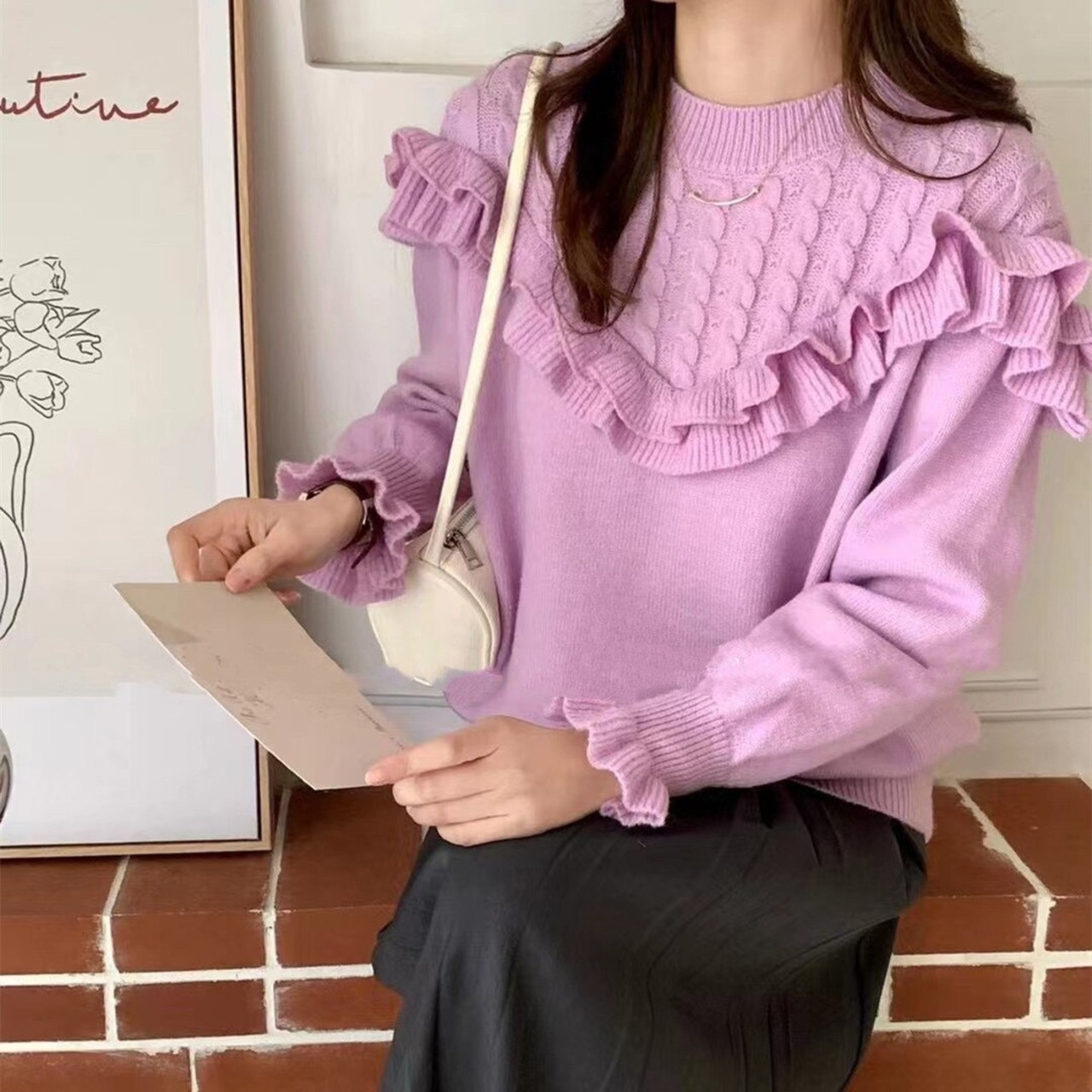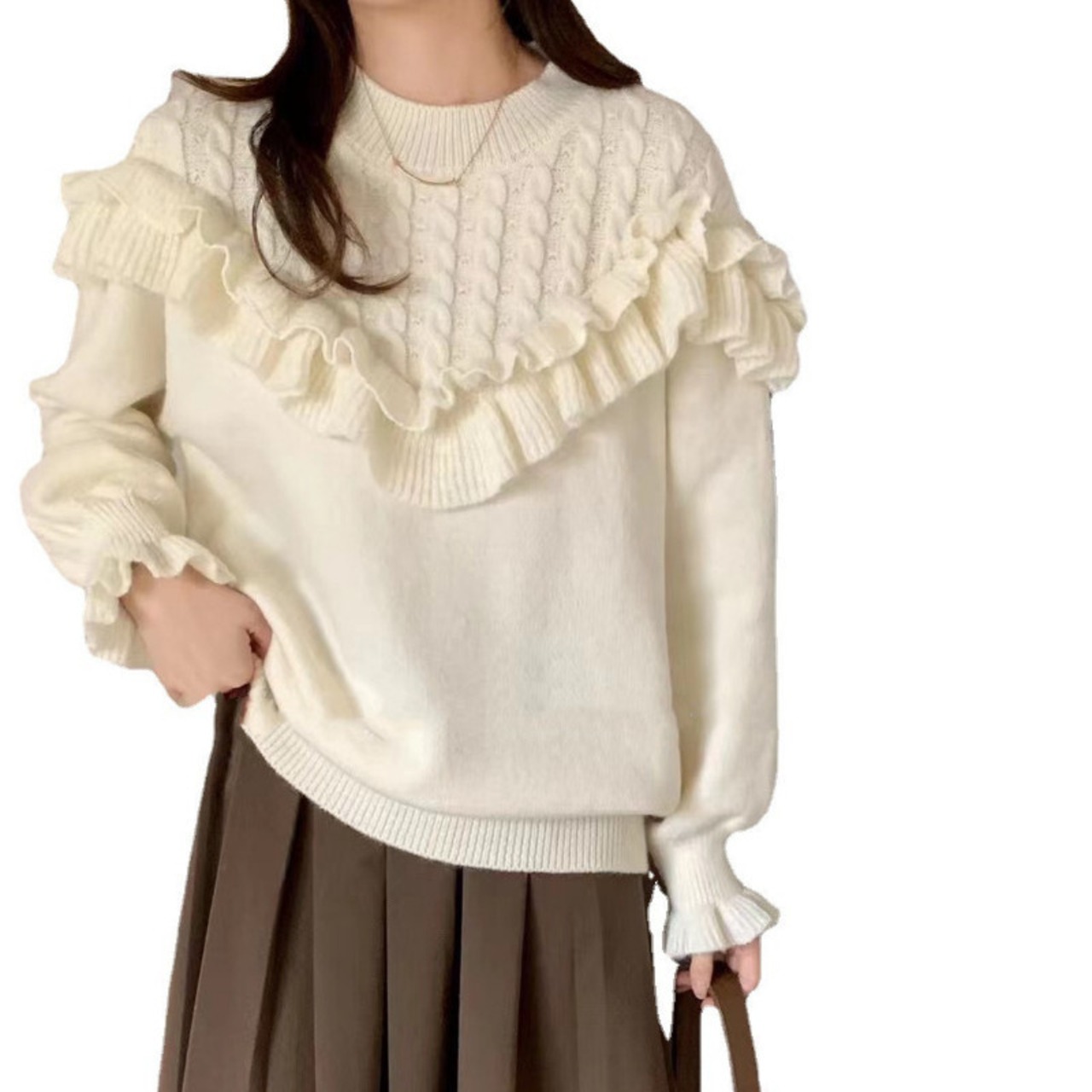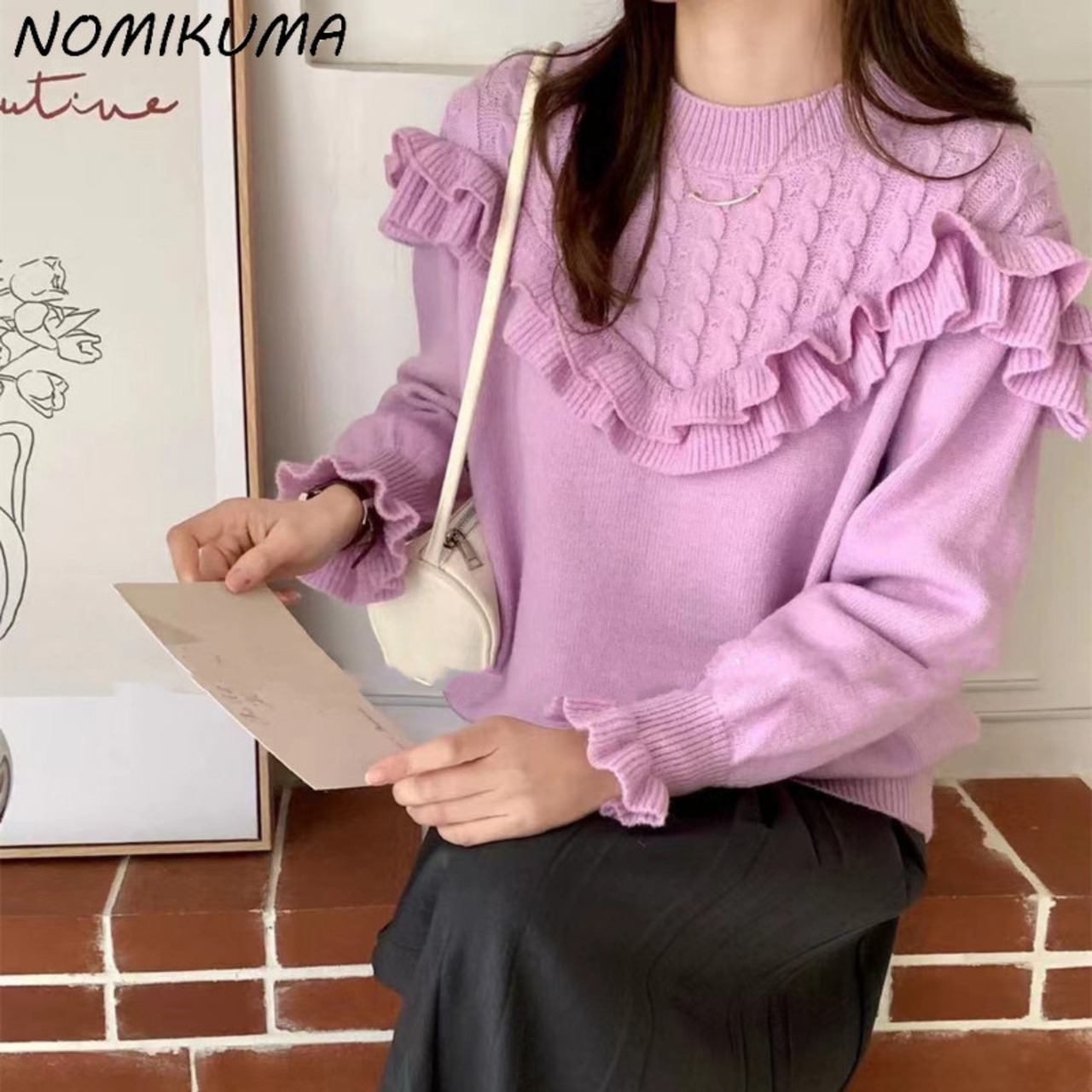 Nomikuma プルシックなフリル O ネックロングスリーブプルオーバーニットカジュアル無地甘い女性ニットセーター秋冬 大人ガーリー スウィート キュート オータム 秋物 ウィンター 冬物 Oネック ソリッドカラー kor2650957473