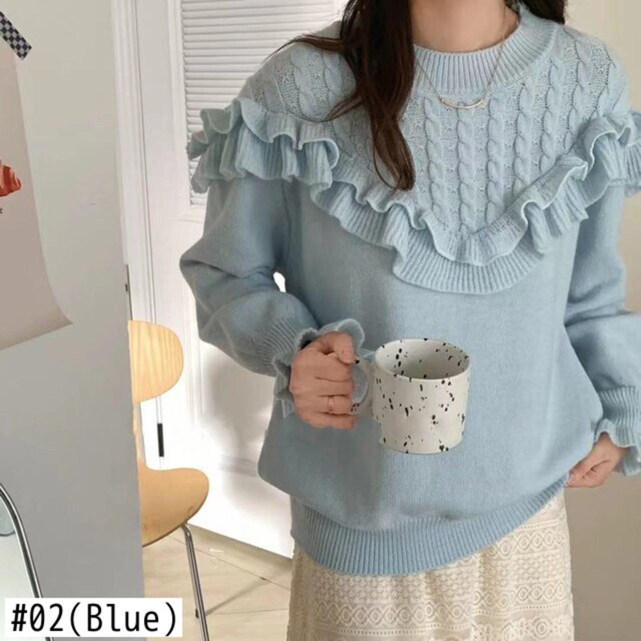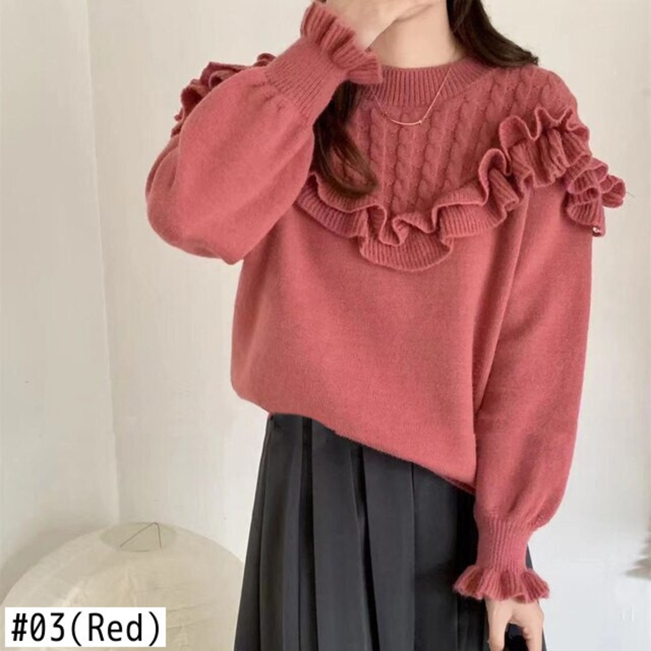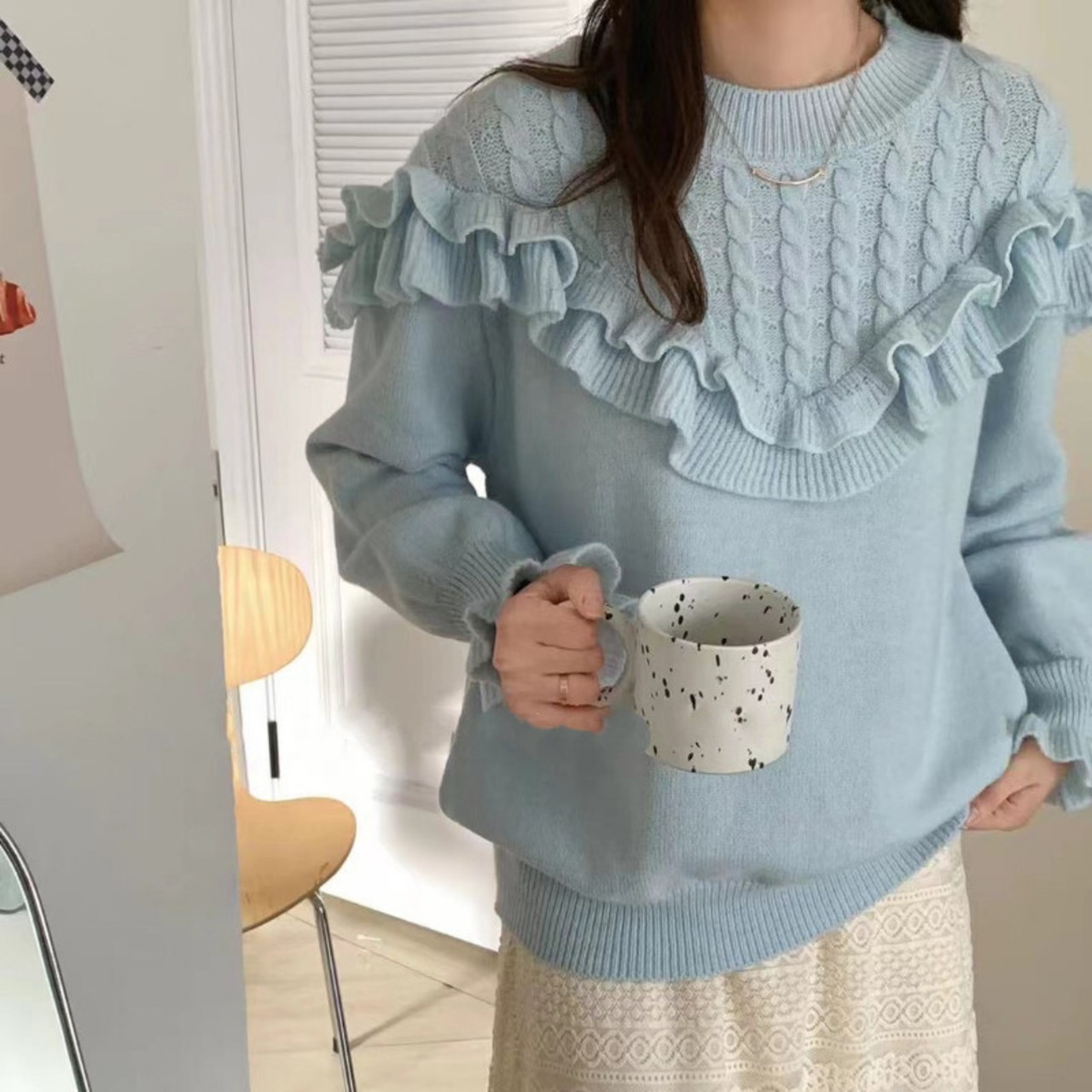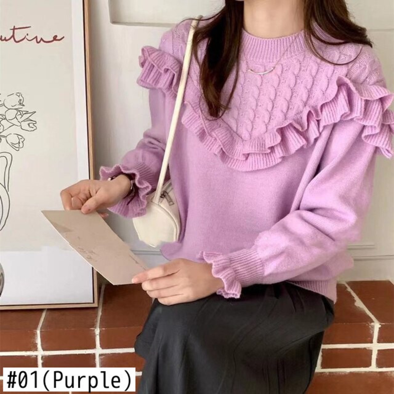 Nomikuma プルシックなフリル O ネックロングスリーブプルオーバーニットカジュアル無地甘い女性ニットセーター秋冬 大人ガーリー スウィート キュート オータム 秋物 ウィンター 冬物 Oネック ソリッドカラー kor2650957473