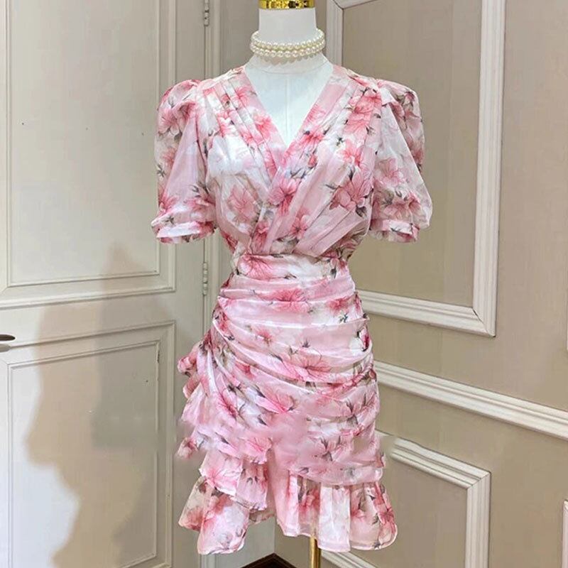 Nomikuma シフォン花女性ドレスひだウエストドレス 2022 夏半袖 V ネックフリルミニ Vestidos ショート ハーフスリーブ サマー 夏物 花柄 Vネック kor70026658544