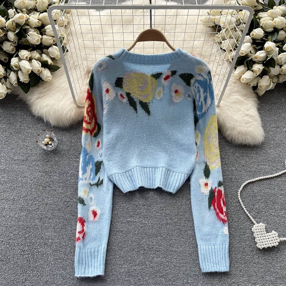 Nomikuma シックな秋冬ニット花柄ジャガードセーターカジュアル長袖Oネックプルオーバーショートニットトップス ロング オータム 秋物 ウィンター 冬物 フラワーデザイン kor99803162464