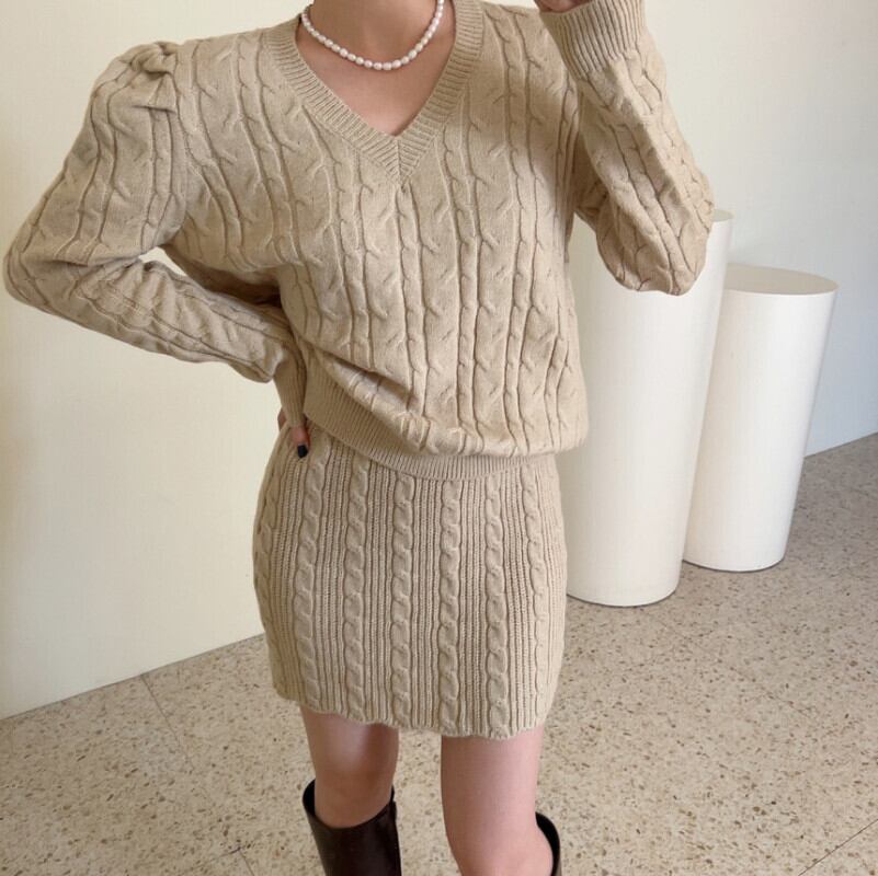 ノミクマ ニット ツイスト 2点セット パフスリーブ Vネック プルオーバー ニット トップス + ウエスト スリム ミニ セーター スカート 2022 kor1670949604
