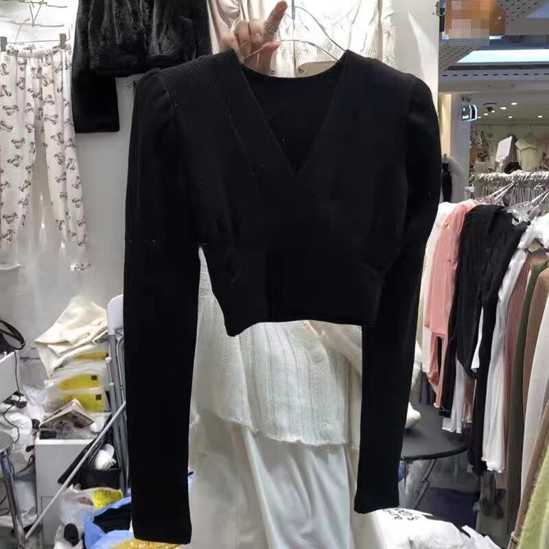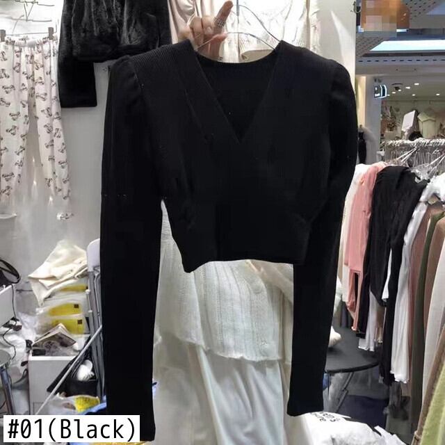 ノミクマ スリムウエスト ショートニット トップス Vネック 長袖 セーター 秋冬 無地 ニット プルオーバー ロング オータム 秋物 ウィンター 冬物 ソリッドカラー kor35219601712