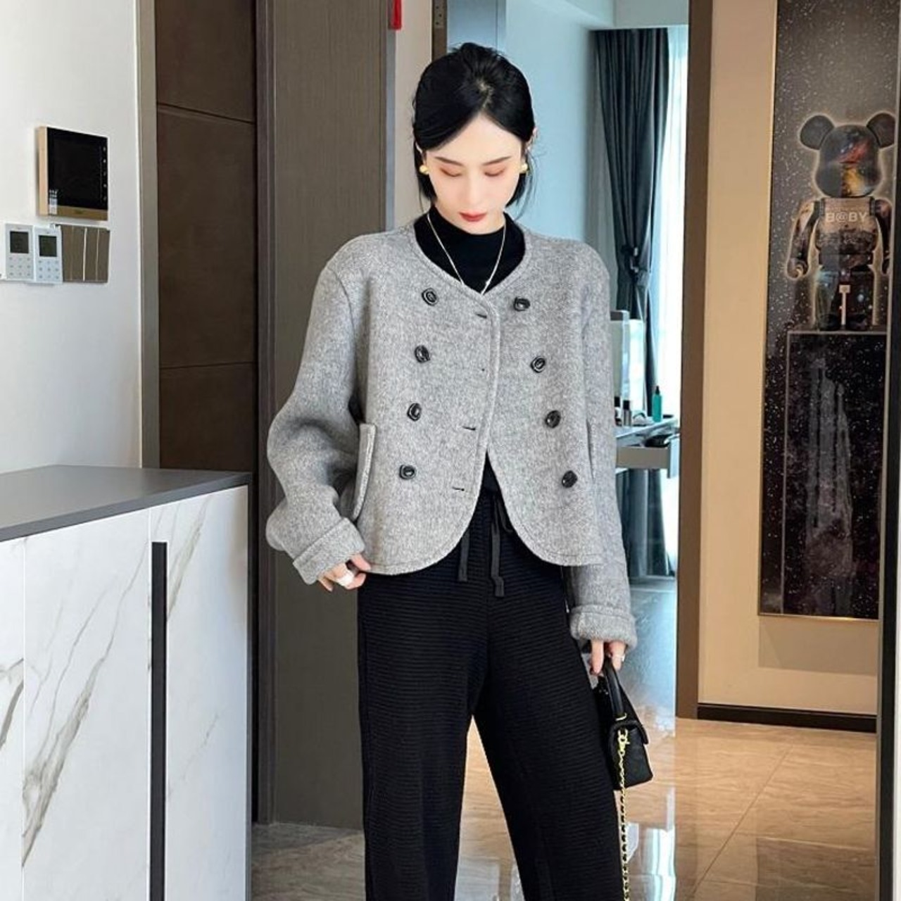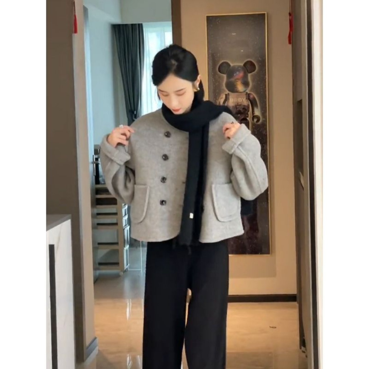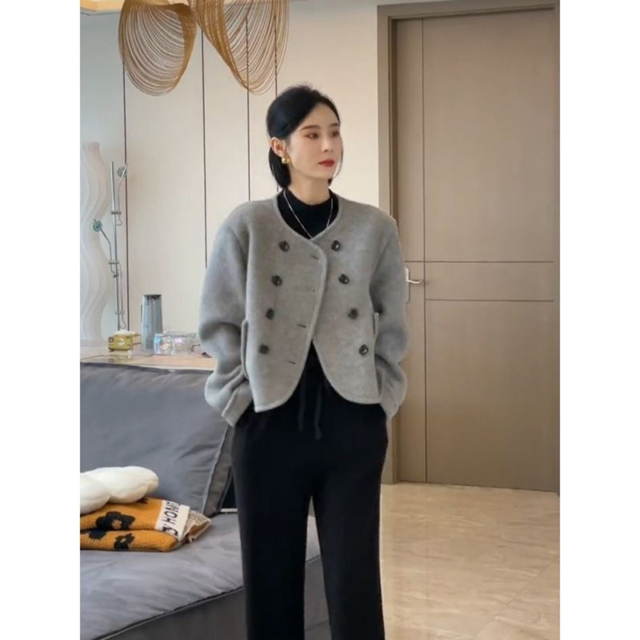 ノミクマ ウール 冬 厚手 ショートコート カジュアル ダブルブレスト Oネック ジャケット 長袖 アウター トップス ロング ウィンター 冬物 kor39895983005