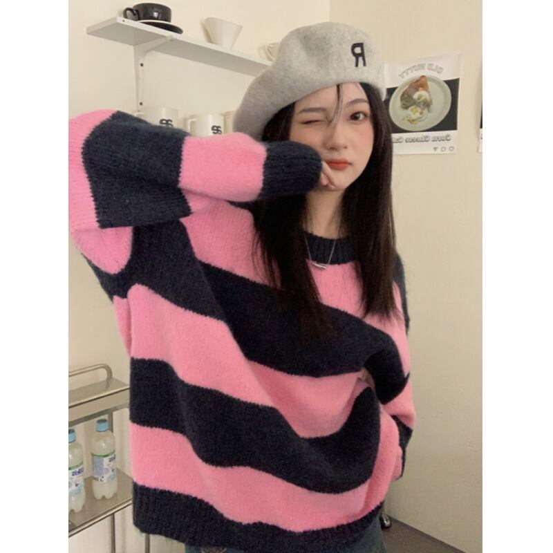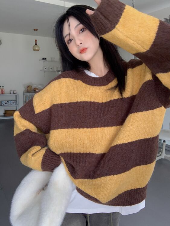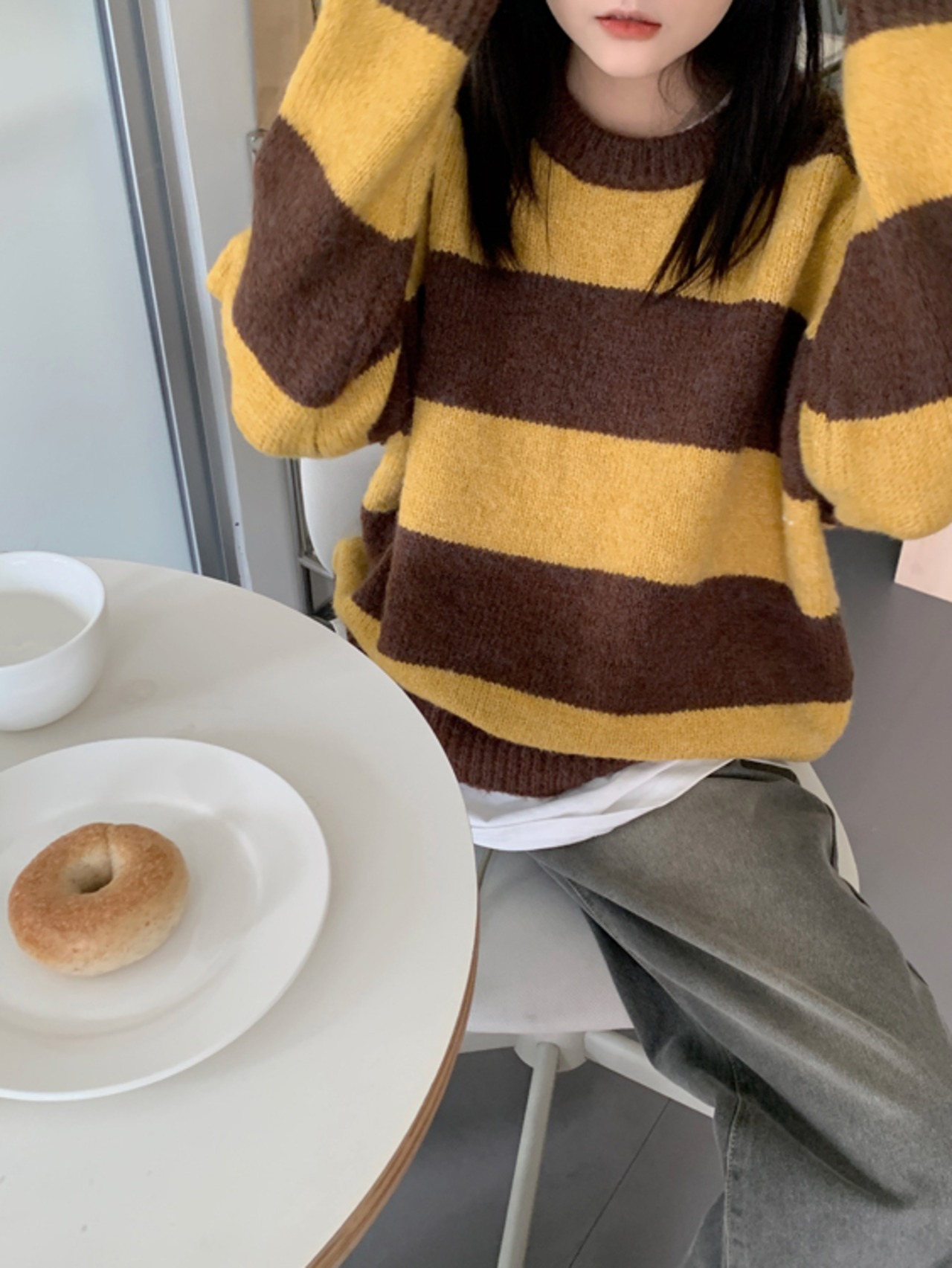 ノミクマ ストライプ ヒットカラーセーター 2022秋冬 プルオーバー 長袖 Oネック プルオーバー ニット トップス ロング オータム 秋物 ウィンター 冬物 kor8121134953