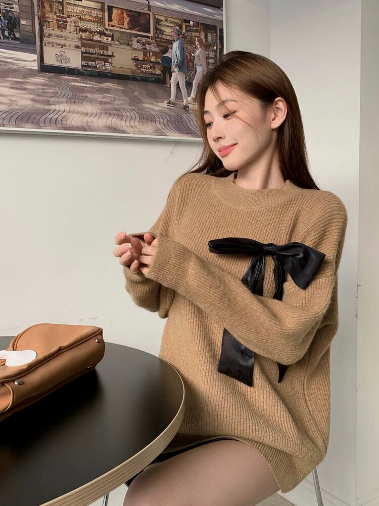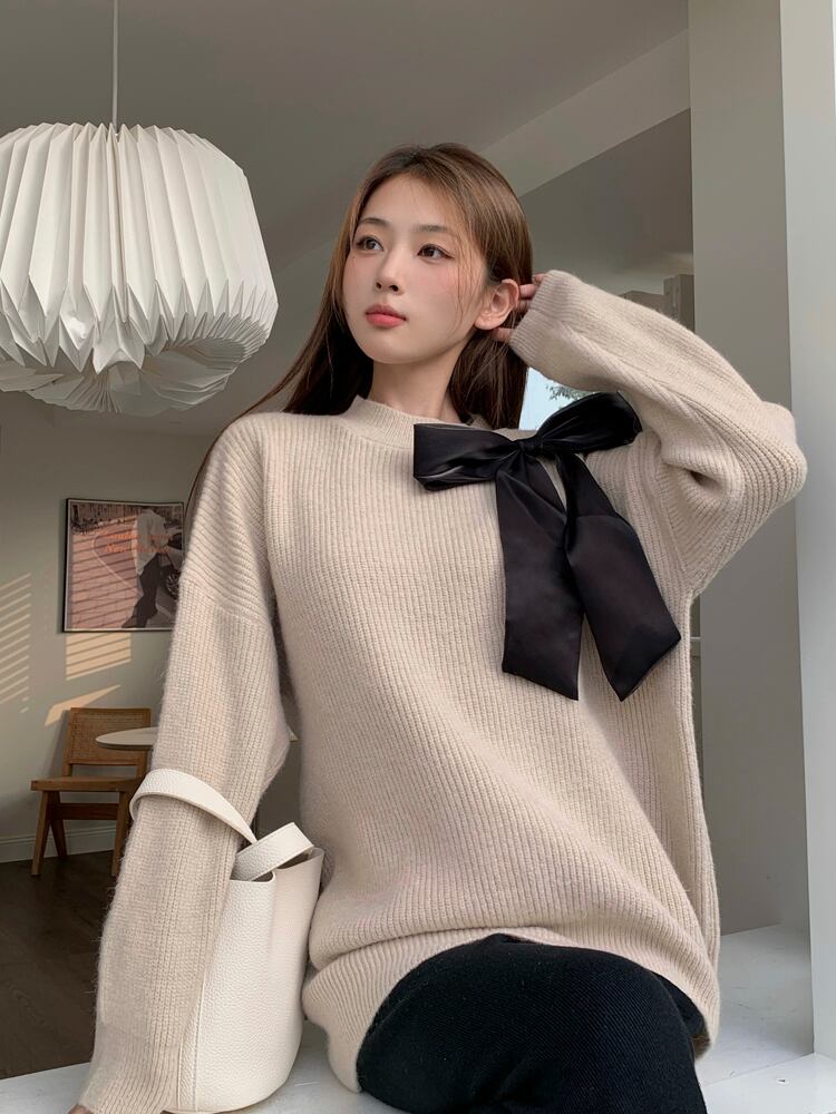 ノミクマ 甘ちょう結び プルオーバー ニットセーター 秋冬 プルオーバー カジュアル 長袖 Oネック ニット トップス ロング リボン 大人ガーリー スウィート キュート オータム 秋物 ウィンター 冬物 kor24641035764