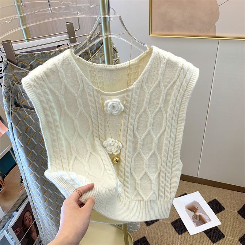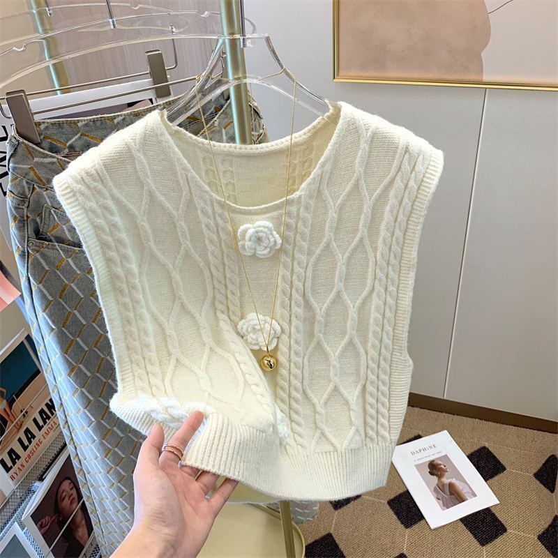 Nomikuma シックな 3D 花セーターベスト甘い秋ノースリーブ O ネックプルオーバー因果ショートニットチョッキ女性 大人ガーリー スウィート キュート カジュアル オータム 秋物 Oネック フラワーデザイン kor29393064002