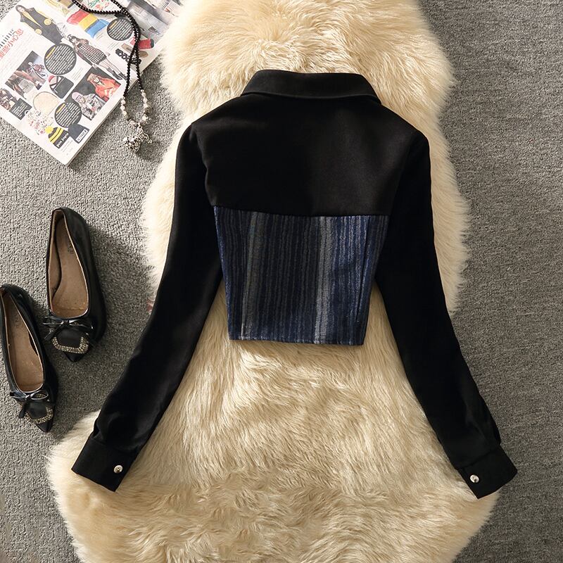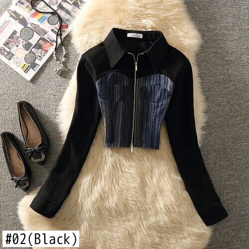 ノミクマ ヒットカラーパッチワーク ショートトップス ジッパー付きロングスリーブ ターンダウンカラー スリムブラウス カミサ kor49906354925