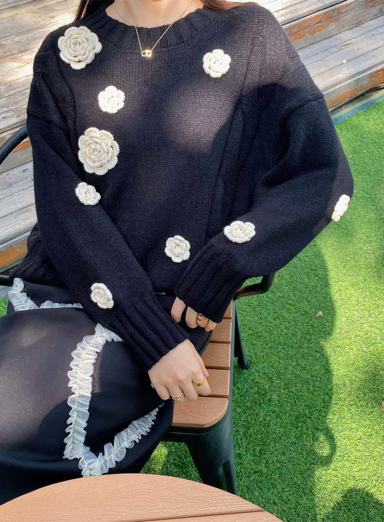 ノミクマシックな甘い花プルオーバーセーター因果長袖 O ネックニット 2022 秋冬ニットトップスプルジャンパー ロング 大人ガーリー スウィート キュート カジュアル オータム 秋物 ウィンター 冬物 Oネック フラワーデザイン kor26721594180