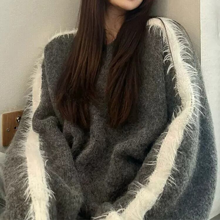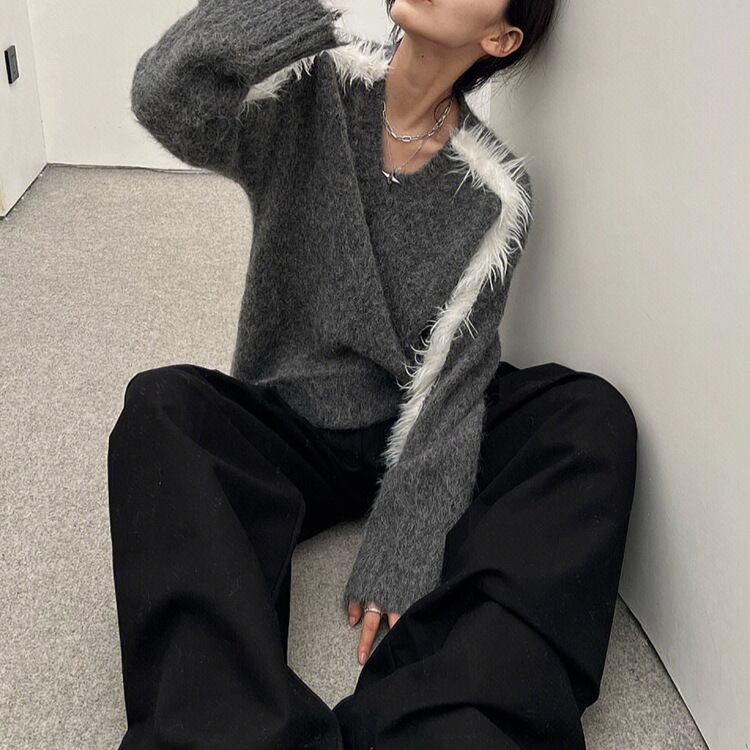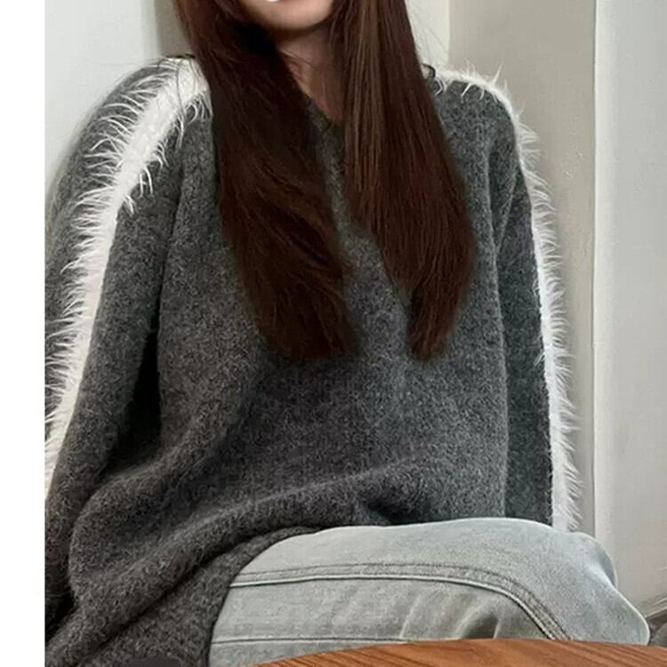 Nomikuma V ネック因果セーター女性秋冬ファーコントラストカラープルオーバー因果長袖ニット ロング オータム 秋物 ウィンター 冬物 Vネック kor88532204831
