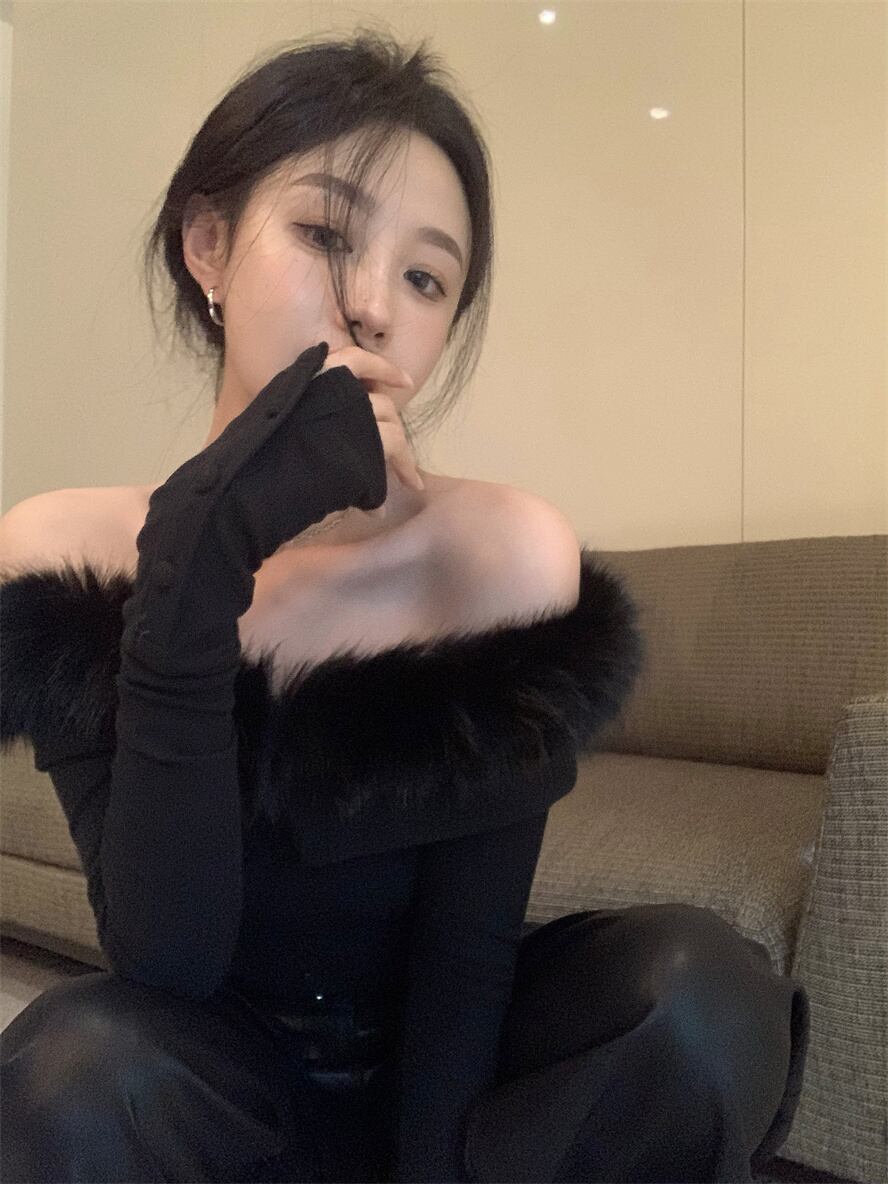 Nomikuma ファーオフショルダーセクシーなストラップレスクロップトップス春秋の女性 Tシャツロング Slevee スリムグラフィック Tシャツ スプリング 春物 オータム 秋物 kor38572002378
