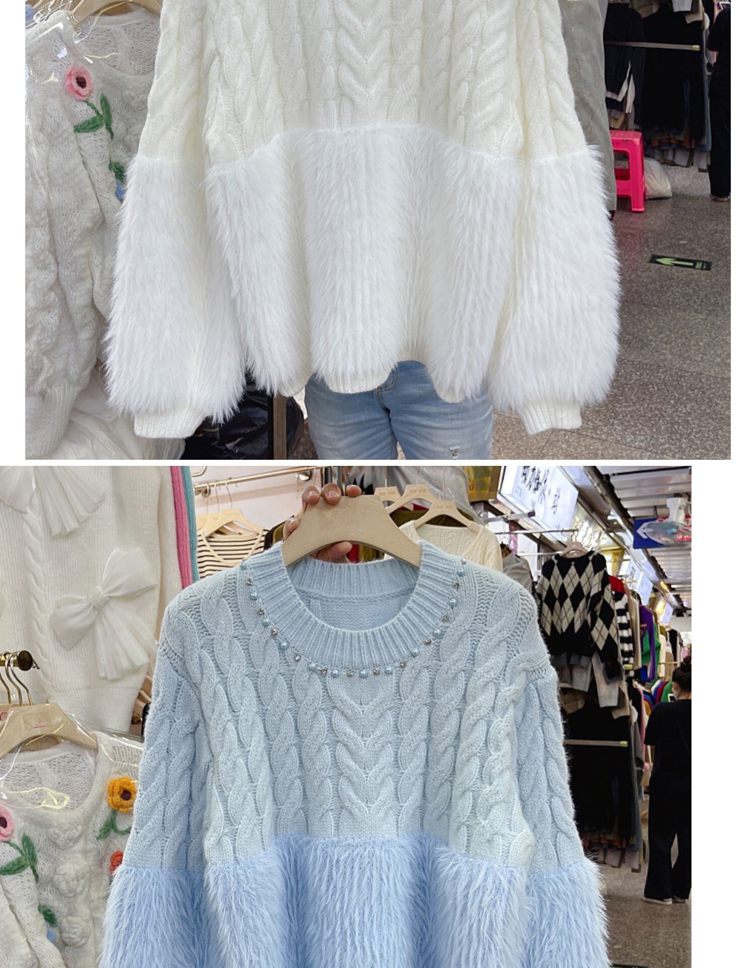 Nomikuma パッチワークフェイクミンクカシミヤセーター女性秋冬プルビーズ O ネックランタンスリーブニット オータム 秋物 ウィンター 冬物 ファー Oネック kor58726966322