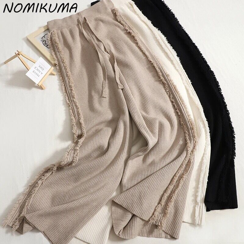 ノミクマテルパッチワークセーターパンツレースアップウエスト長ズボン2022秋冬ニットワイドレッグパンツ ロング オータム 秋物 ウィンター 冬物 ワイドパンツ kor19510333574