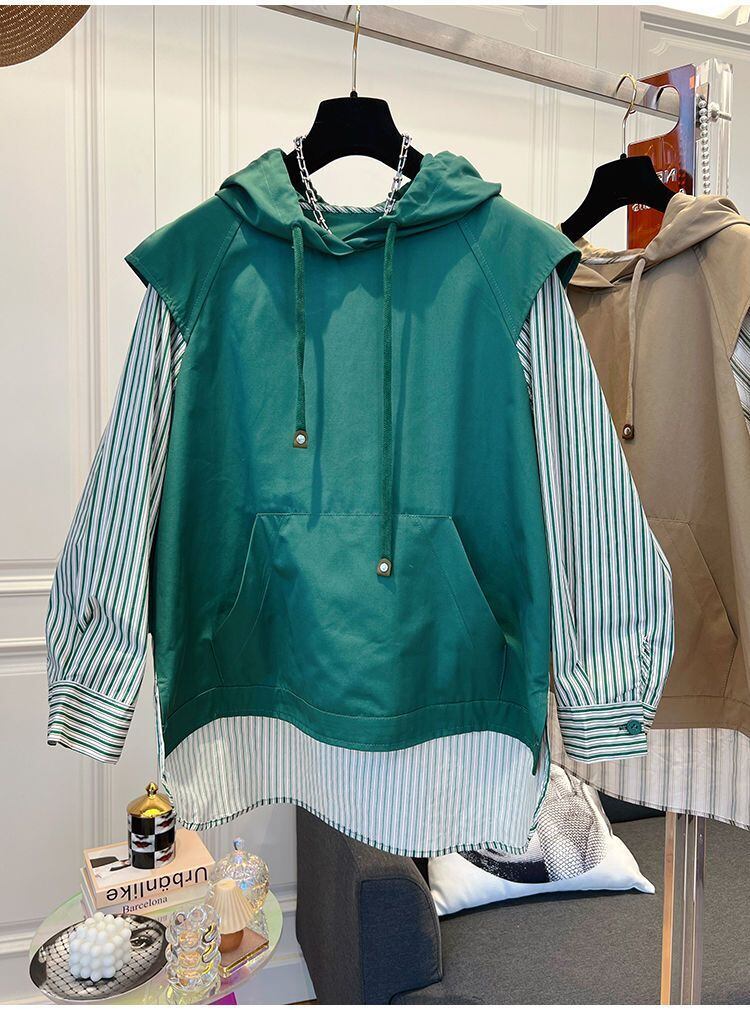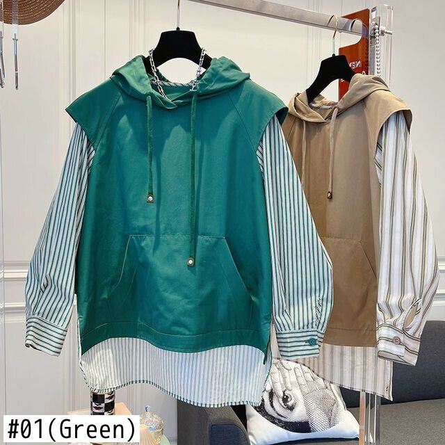 Nomikuma 因果ストライプ ブラウス パッチワーク フード付き スウェットシャツ 長袖 プルオーバー 春秋 パーカー トップス ロング スプリング 春物 オータム 秋物 kor19072283398