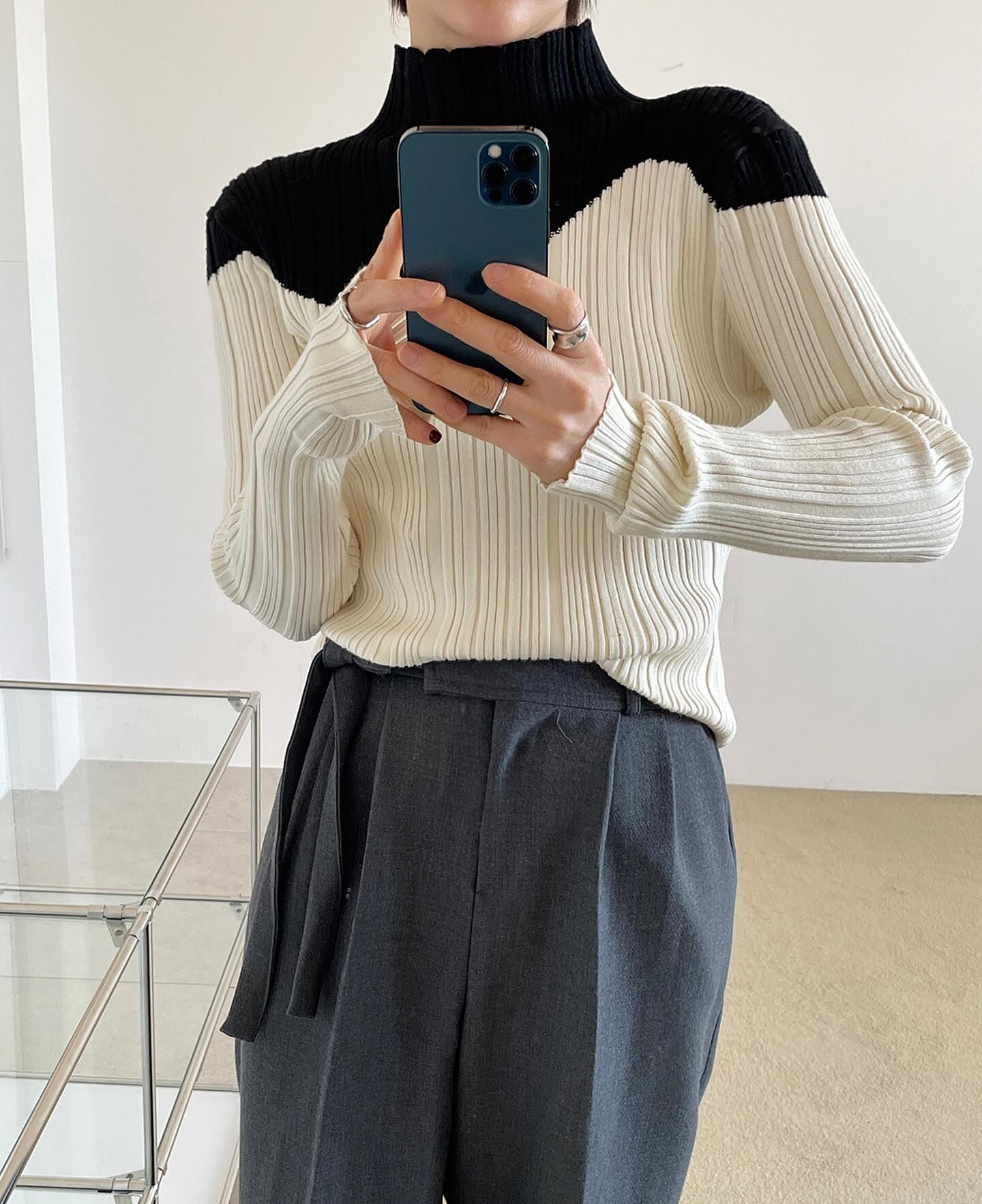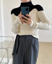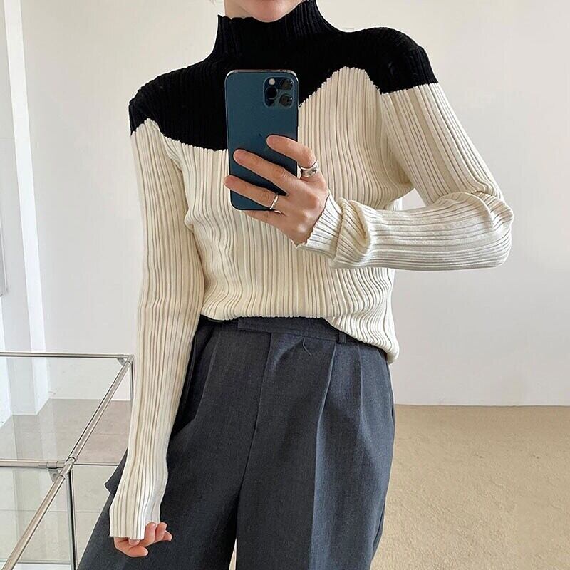 ノミクマ 秋冬 コントラストカラー プルオーバー ニットセーター 長袖 タートルネック 底入れ スリム ストレッチ ニット ロング オータム 秋物 ウィンター 冬物 kor96651207229