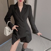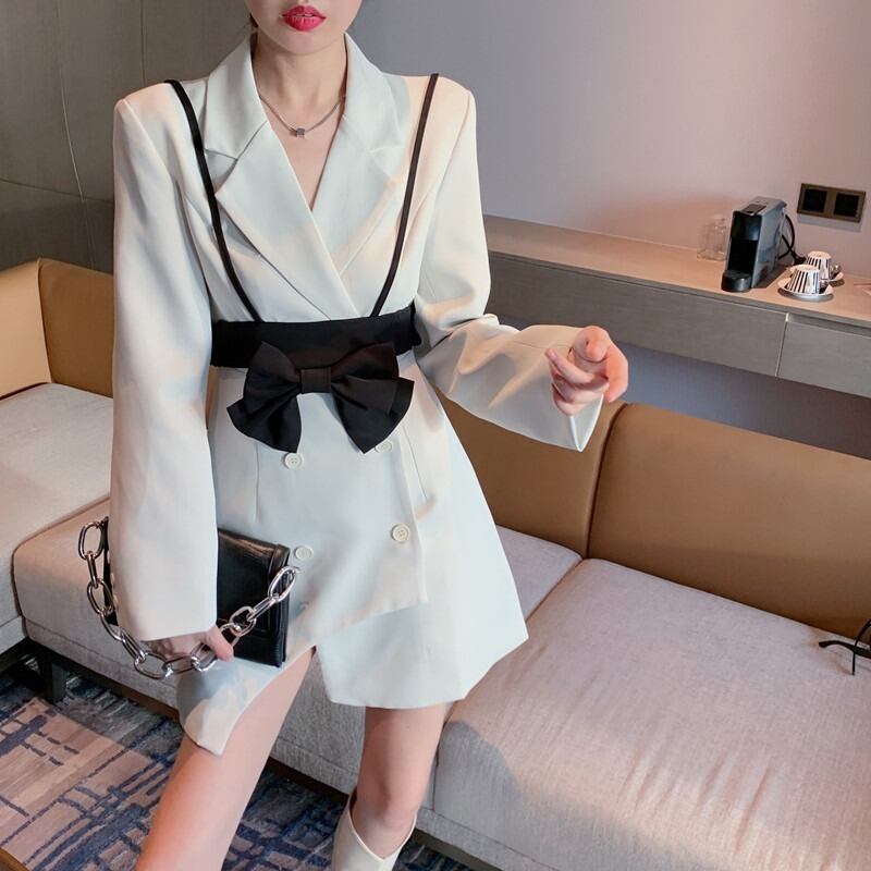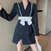 ノミクマ ダブルブレスト スリムウエスト ノッチドカラー 長袖 ミニワンピース+シックちょう結び スリングベスト 春 レディース セット ロング リボン スプリング 春物 kor49162688943