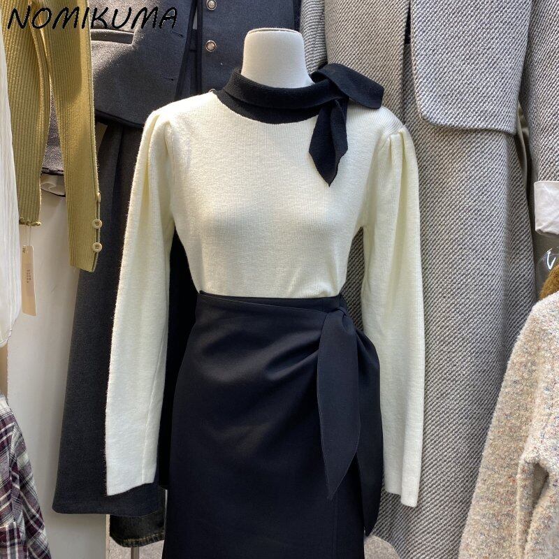 ノミクマ シック ヒットカラー 蝶ネクタイ Oネック ニット 秋冬 長袖 ボトムス セーター 2022年 ニットトップス ロング リボン オータム 秋物 ウィンター 冬物 kor79439199083