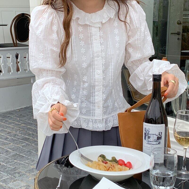 Nomikuma シックな花刺繍女性シャツピーターパン襟パフスリーブブラウストップス春秋 スプリング 春物 オータム 秋物 花柄 kor30404354815