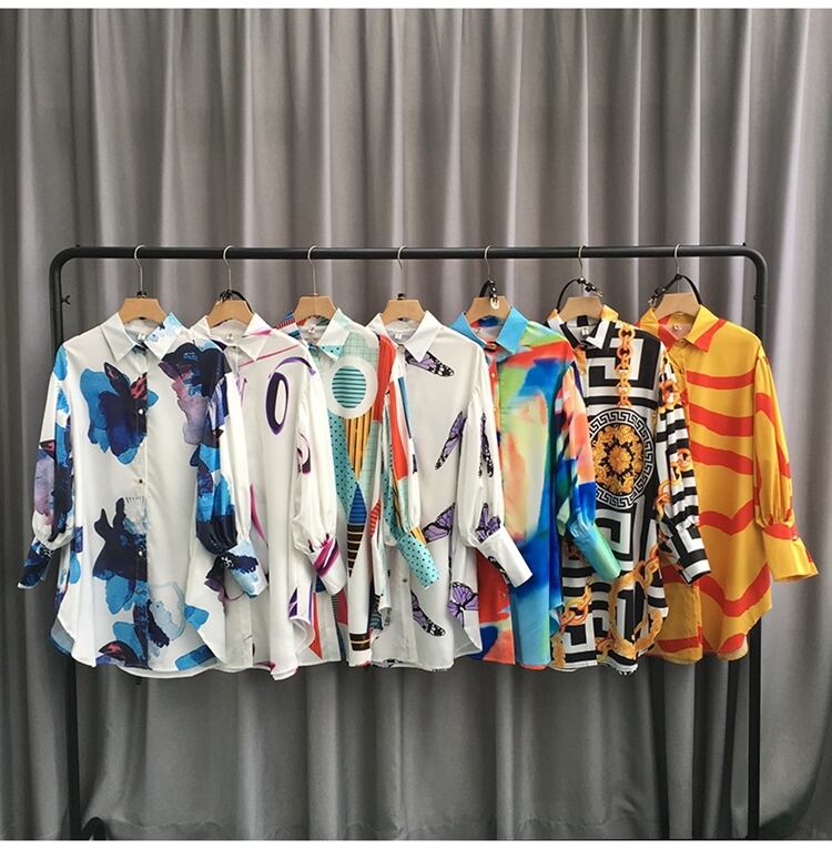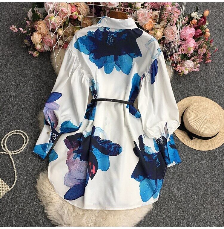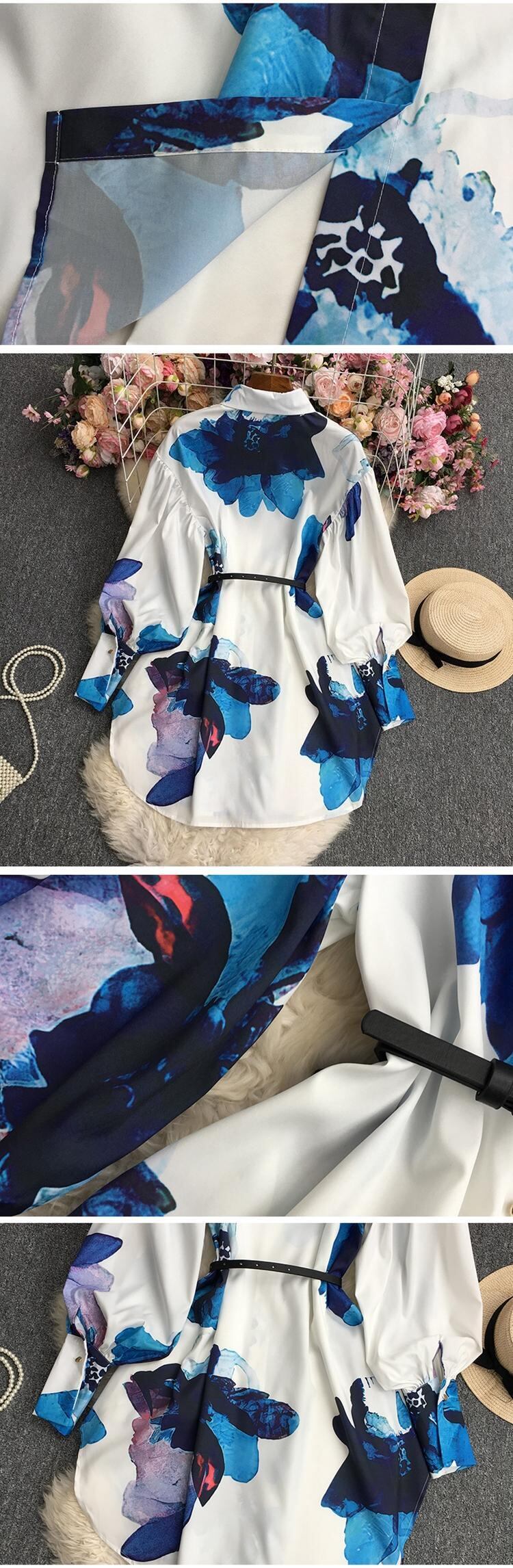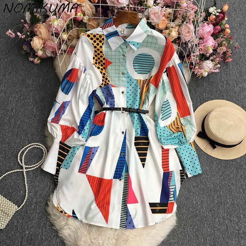 ノミクマプリントベルト スリムウィスト ミディアムロング ブラウス シャツ 長袖 ターンダウンカラー スプリングトップス 春物 ハーネス kor39668323662