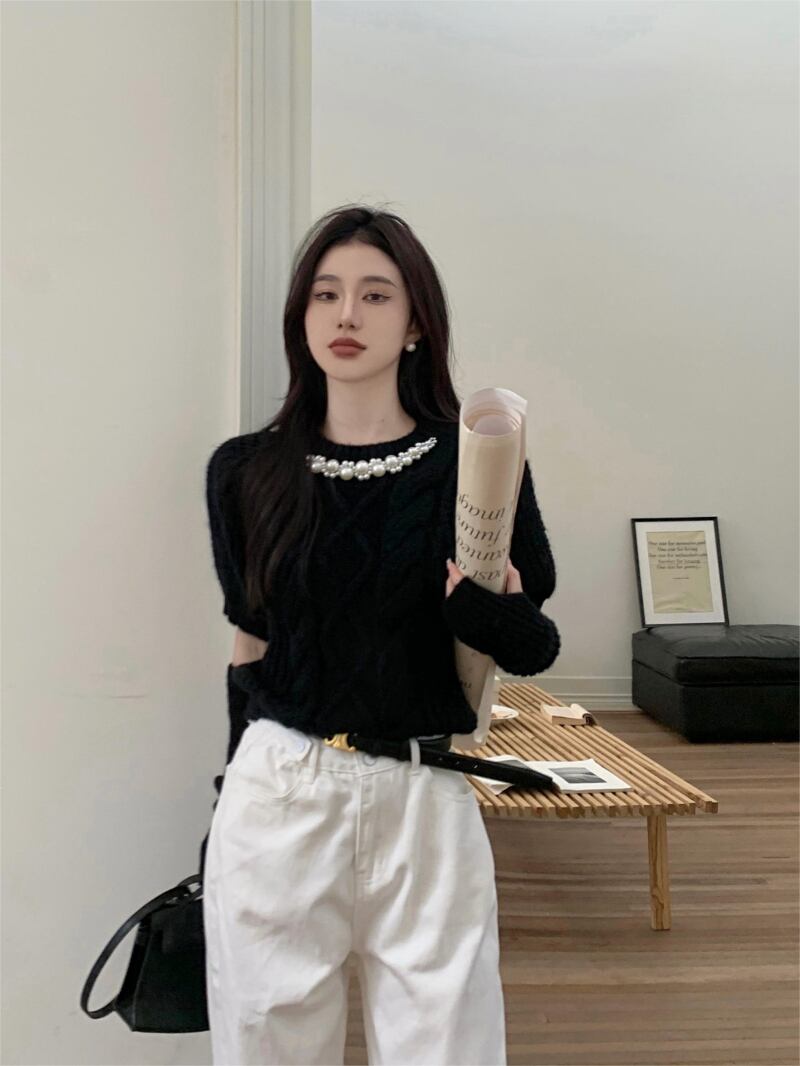 Nomikuma シックなビーズ O ネック プルオーバー ツイスト ニット トップス パフ スリーブ春秋の女性ニット セーター スプリング 春物 オータム 秋物 Oネック kor59174325177