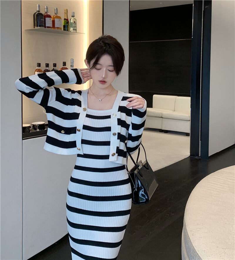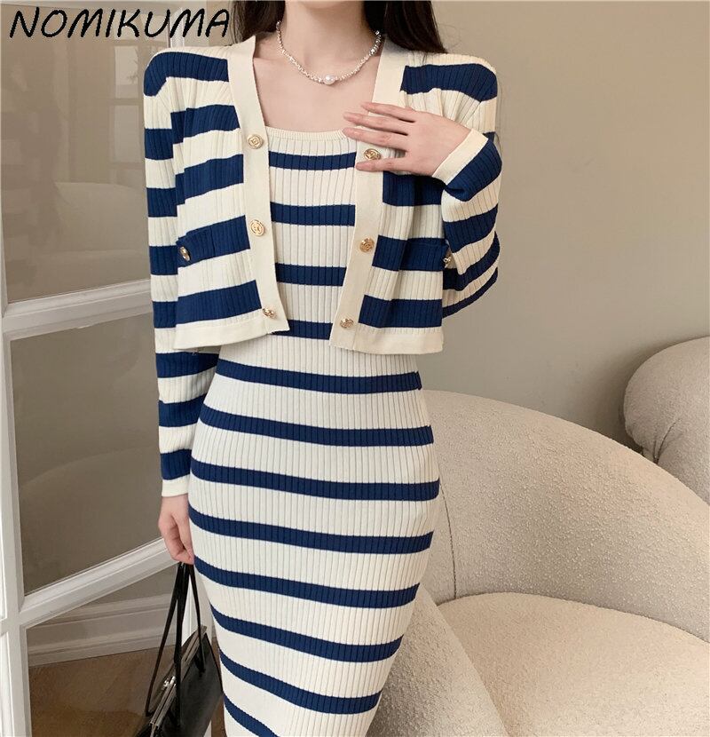 Nomikuma 女性秋ヒットカラーストライプニット 2 点セット長袖ニットコート + スリムストレッチスリング Bodycorn ドレス ロング オータム 秋物 kor60725108331