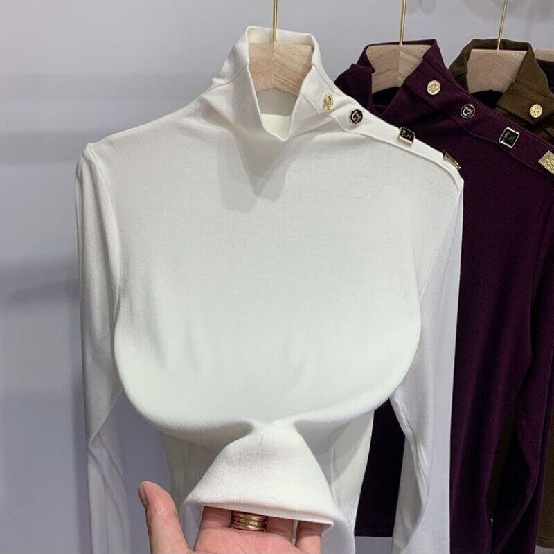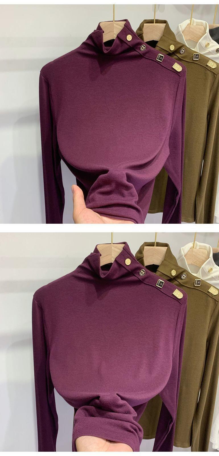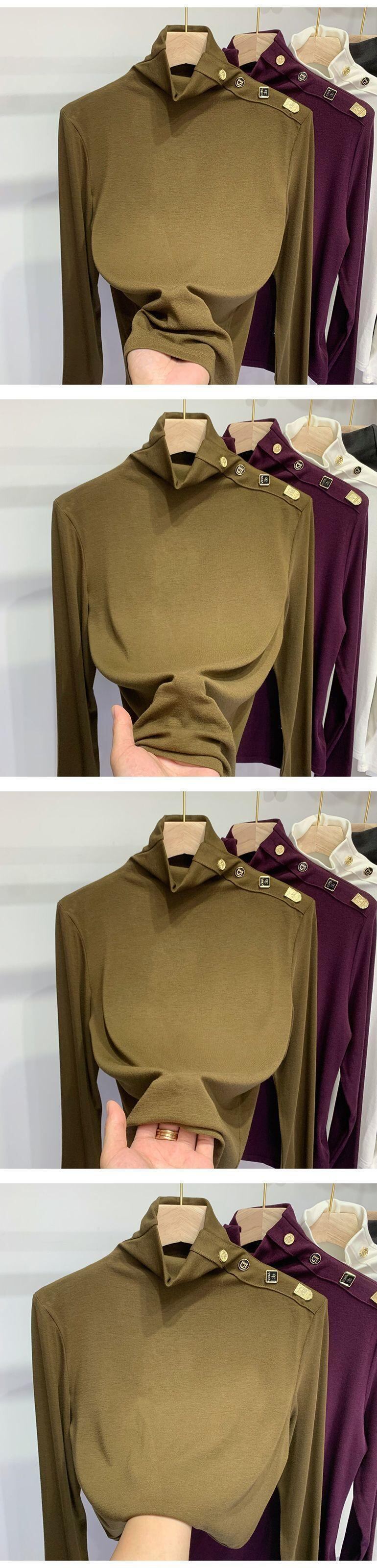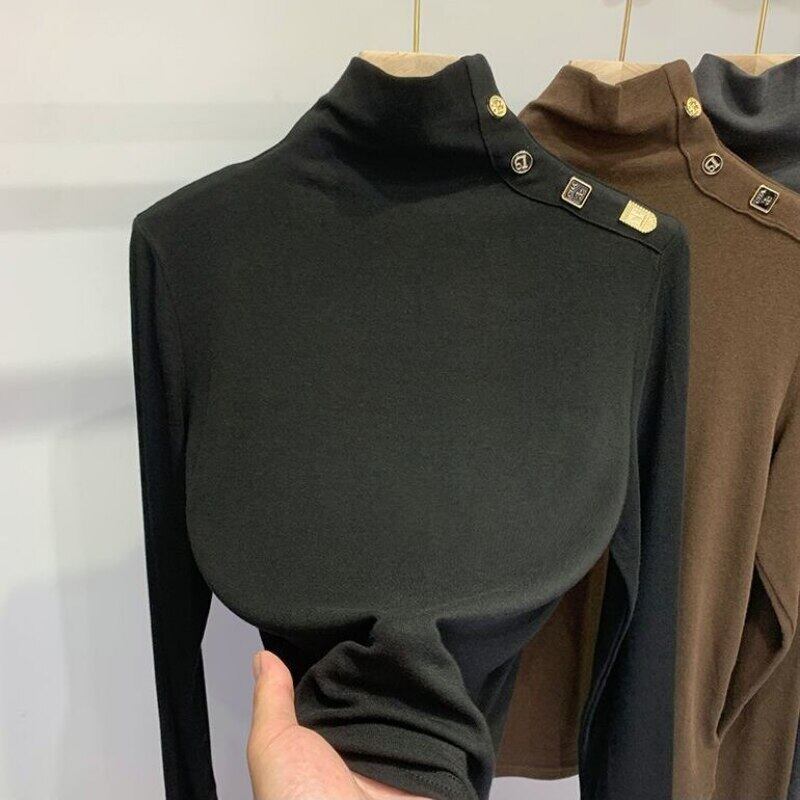 Nomikuma ハーフカラー底入れ Tシャツ秋冬シックなボタン女性トップス長袖ソリッドグラフィック Tシャツ ロング オータム 秋物 ウィンター 冬物 ソリッドカラー kor40896198427