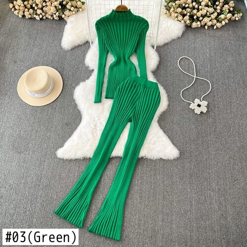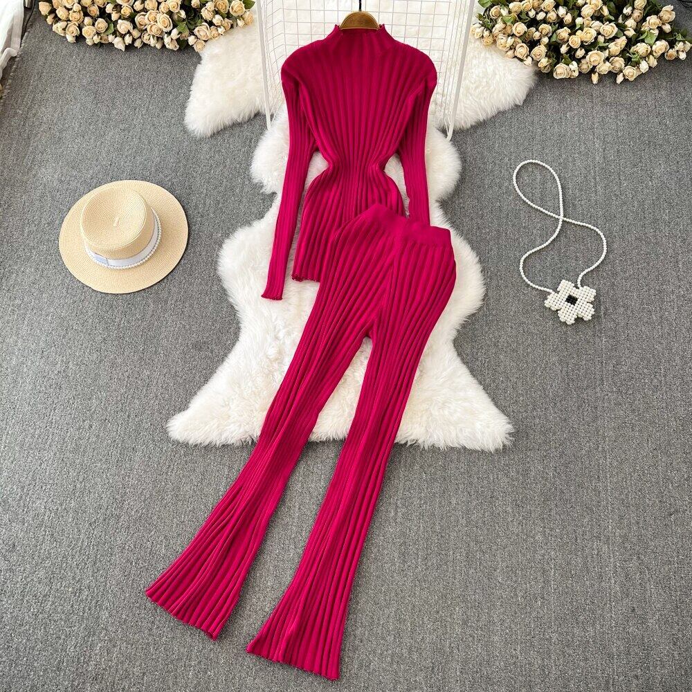 ノミクマ ニット ストレッチ スリム ツーピース レディース 衣装 長袖 スタンドカラー ニット + ウエストフレア 長ズボン セット ロング kor14125160738