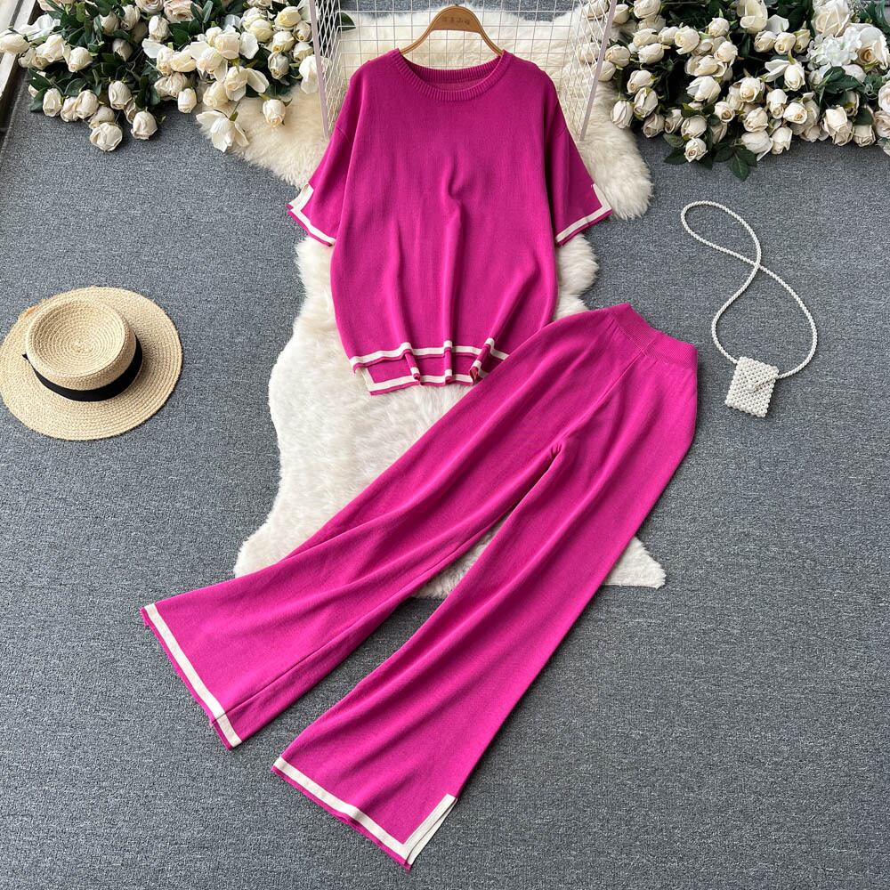ノミクマ ニット ツーピース レディース セット ヒットカラー 半袖 Oネック プルオーバー ニット + ウエスト ワイドレッグ ロング セーター パンツ ショート ハーフスリーブ ワイドパンツ kor94454629191