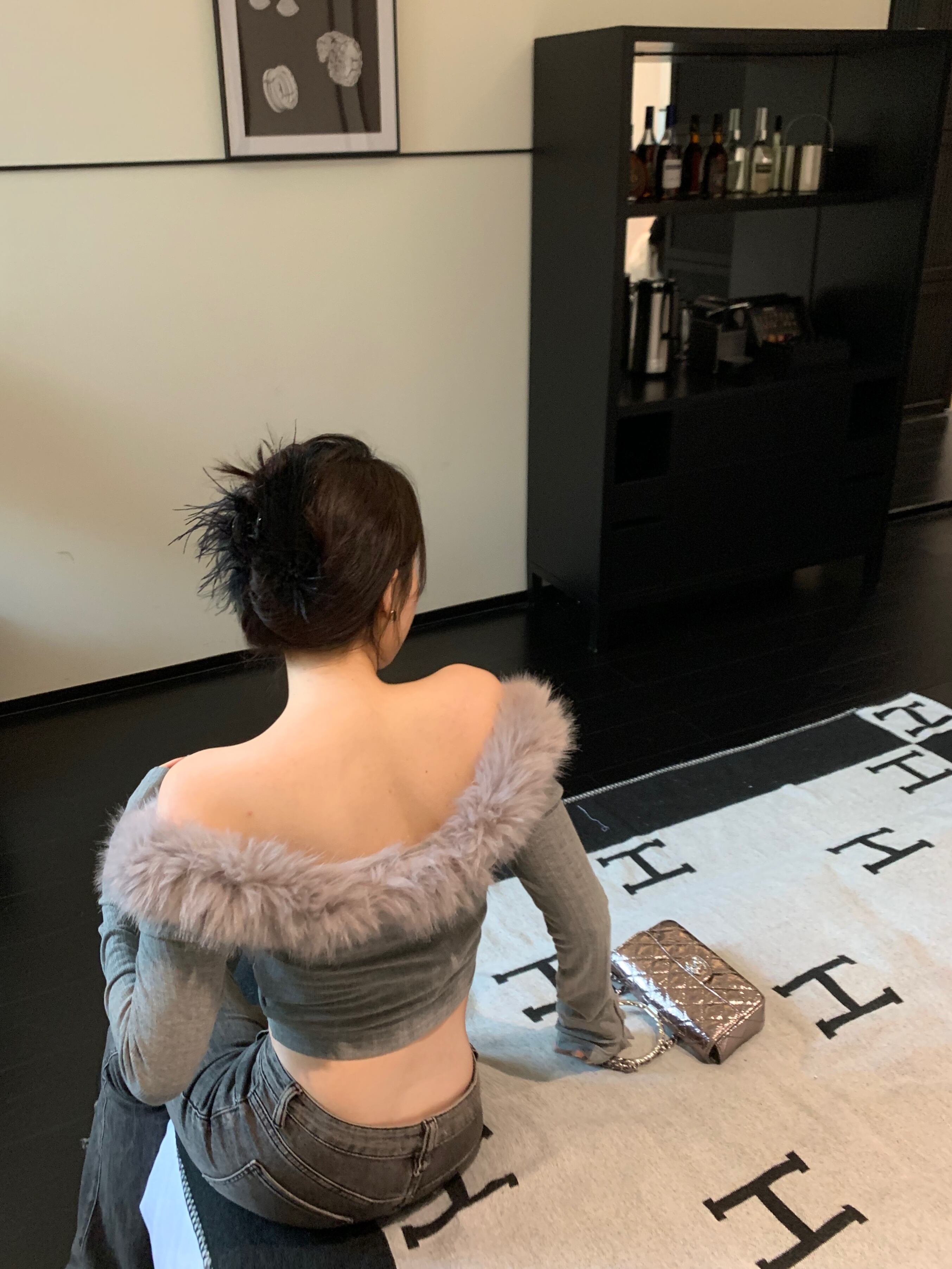 Nomikuma 毛皮オフショルダーセクシーなストラップレスの女性 Tシャツ 2023 春長袖巾着スリムショートグラフィック Tシャツ ロング スプリング 春物 kor43166951640