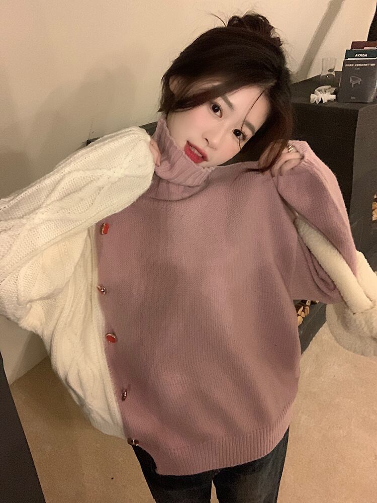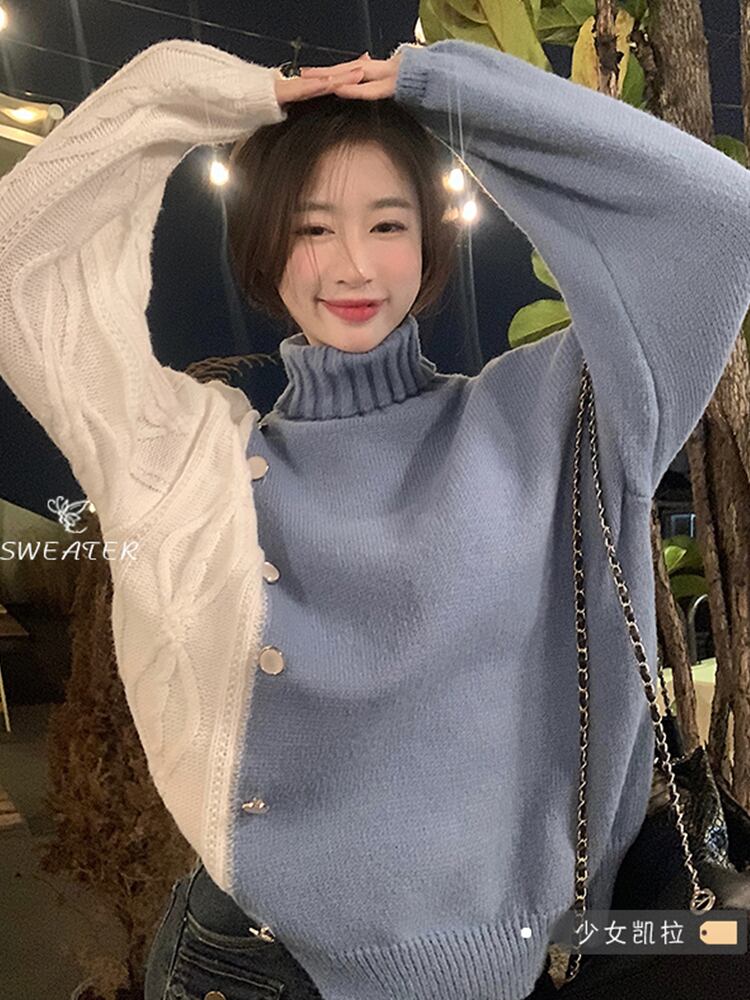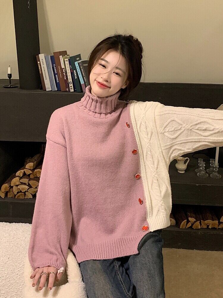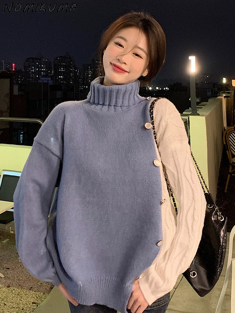 ノミクマ イレギュラー コントラスト カラー ボタン プルオーバー タートルネック セーター 長袖 プルオーバー 秋冬 ニット ロング オータム 秋物 ウィンター 冬物 kor85964098508