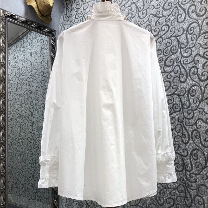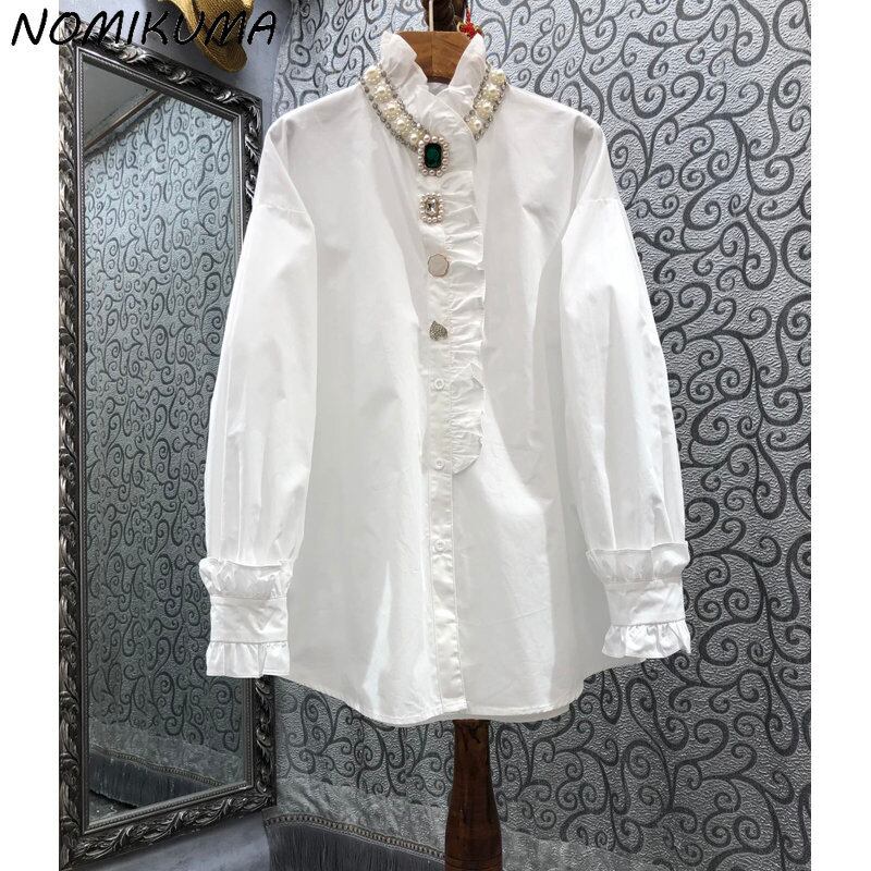 ノミクマ ビーズ ダイヤフリル スタンドネック シングルブレスト ブラウス トップス 2023年春 カジュアル ランタンスリーブ シャツ スプリング 春物 kor67603728583