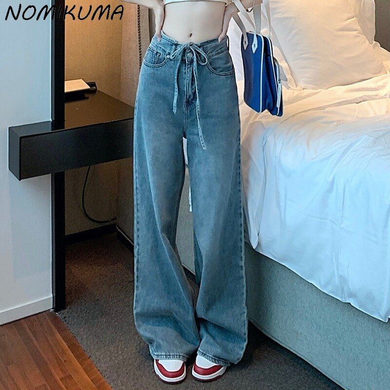 Nomikuma 巾着レースアップウエスト徳民長ズボン女性春秋 2023 長ズボン因果ワイドレッグジーンズパンツ ロング スプリング 春物 オータム 秋物 ワイドパンツ kor99848680934