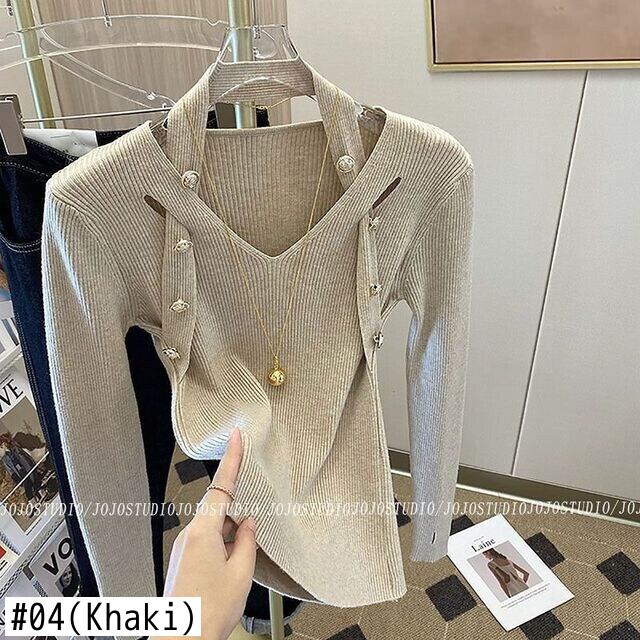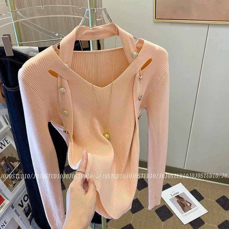 Nomikuma セクシーなシックなボタンホルター V ネックスリムストレッチニットトップス 2023 春長袖女性ニットセーター ロング スプリング 春物 Vネック kor24678009353