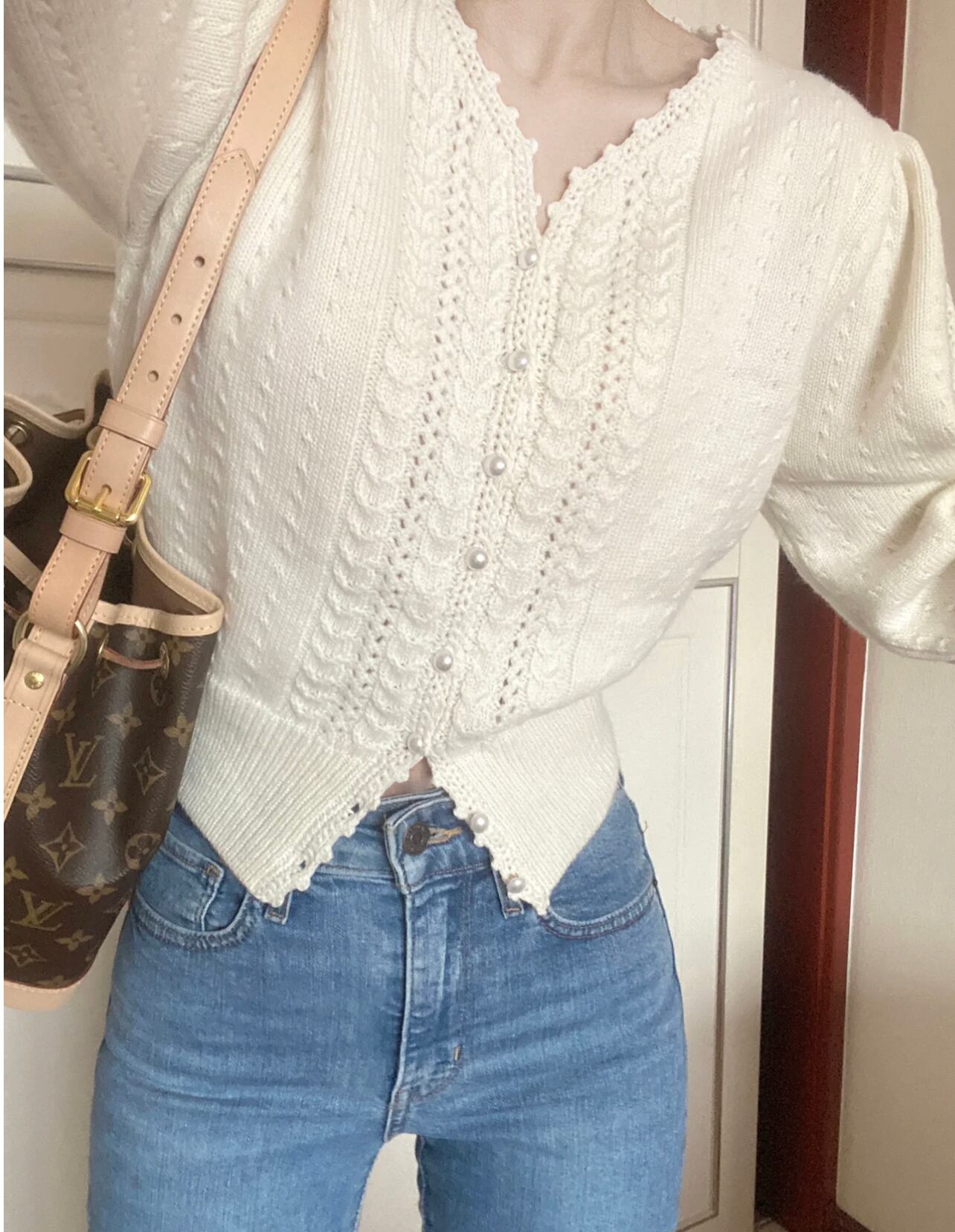 Nomikuma ランタンスリーブニット女性春 2023 中空アウト V ネックショートスタイルニットセーターコート スプリング 春物 Vネック kor51448335011