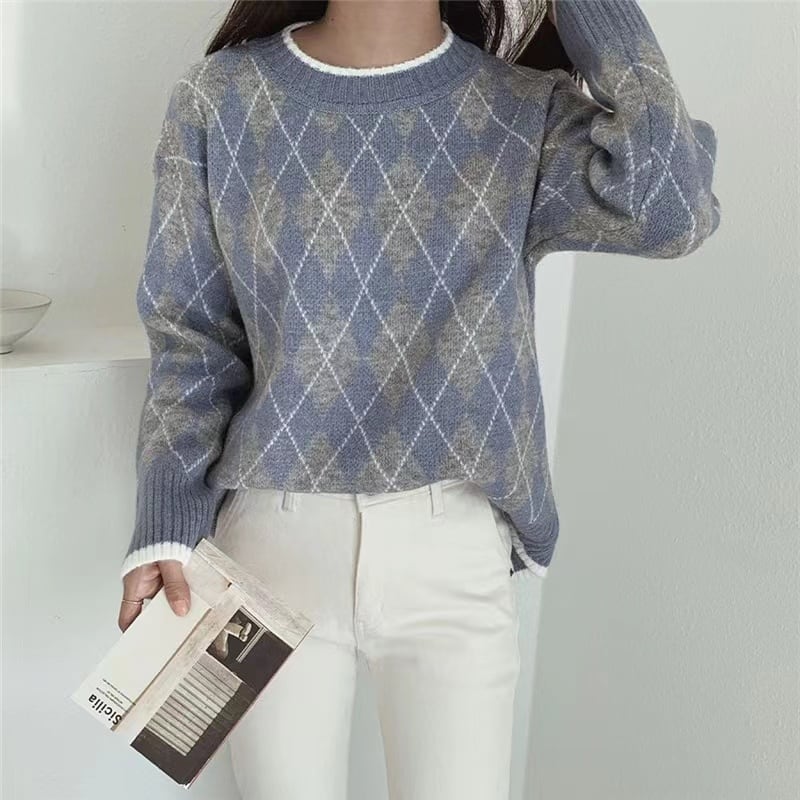 ノミクマ パフ ヒットカラー Oネック プルオーバー アーガイル ジャカード ニット カジュアル 長袖 秋冬 ニットセーター ロング オータム 秋物 ウィンター 冬物 kor30463075757