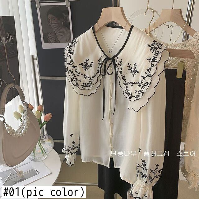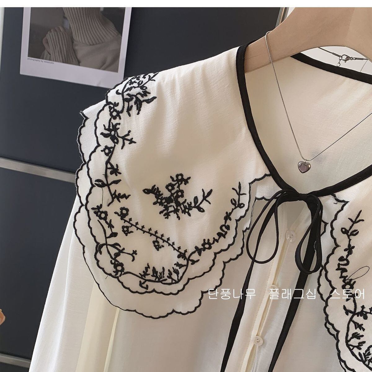 Nomikuma フリル ピーターパン襟刺繍長袖ブラウス女性 2023 春シフォン シャツ ロング スプリング 春物 kor50184599544