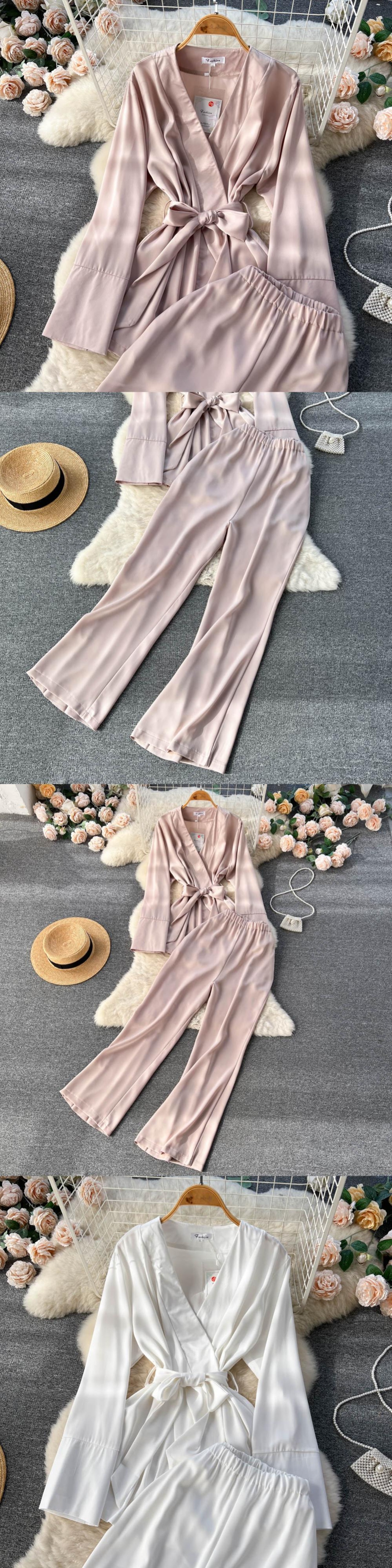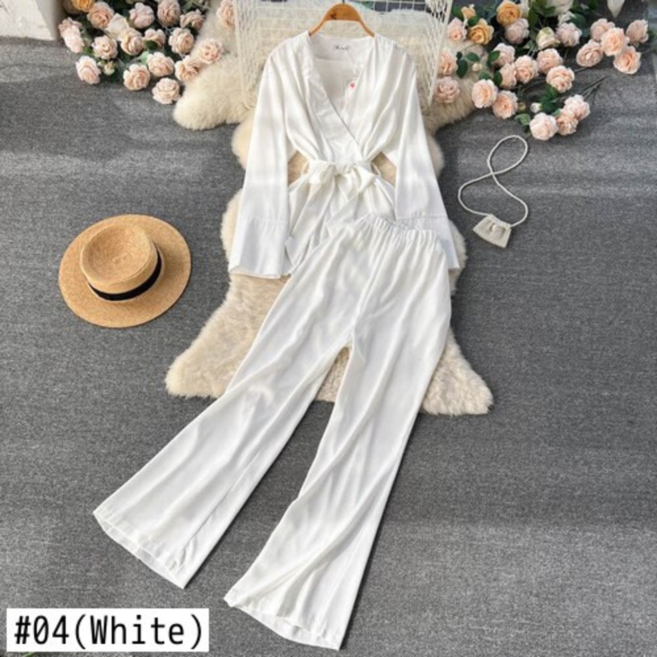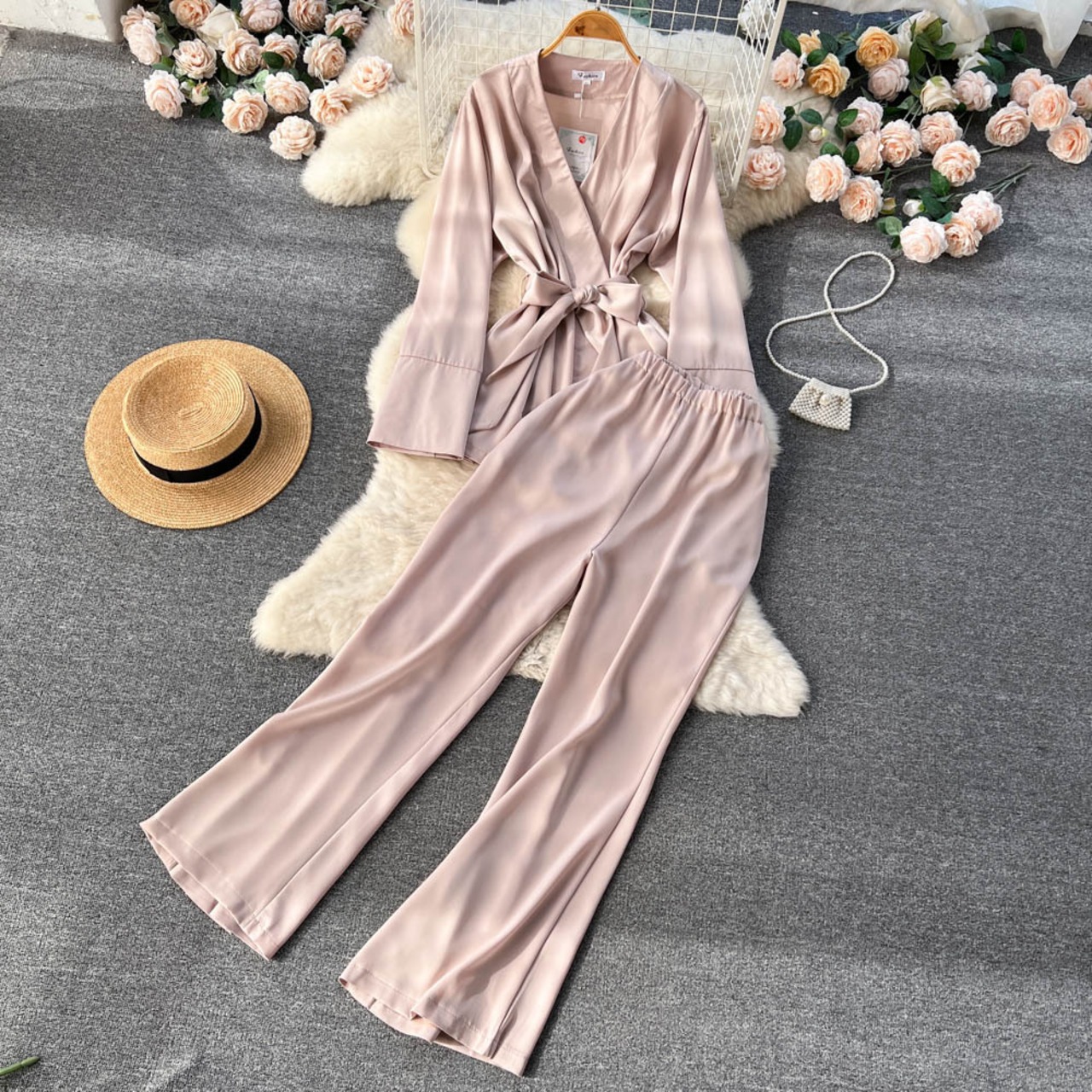 Nomikuma 2 ピース女性春セット弓包帯長袖 V ネックトップス + 弾性ウエストワイドレッグパンツ 2023 衣装 ロング リボン エラスティック 伸縮 スプリング 春物 Vネック ワイドパンツ kor64372958344