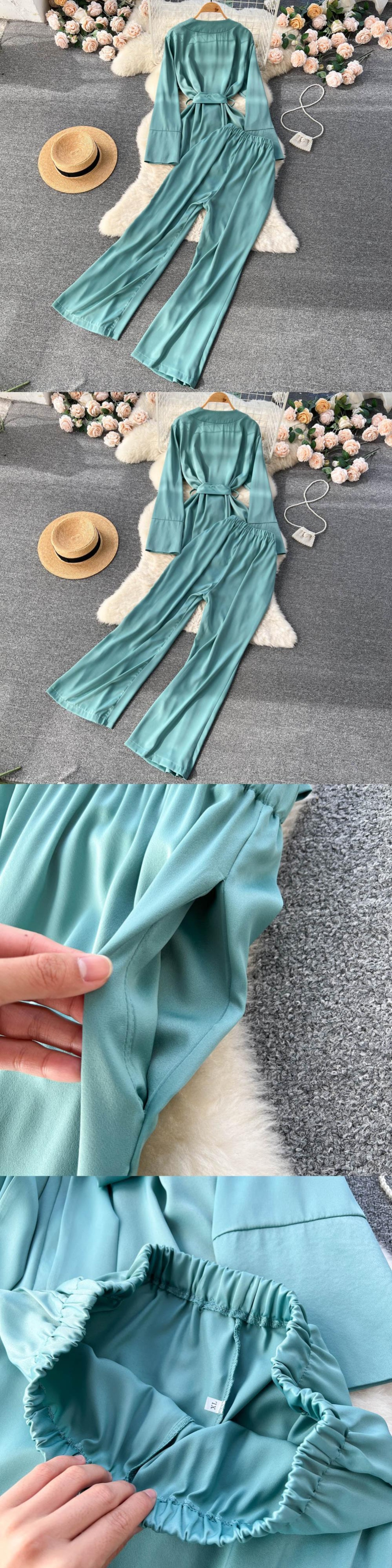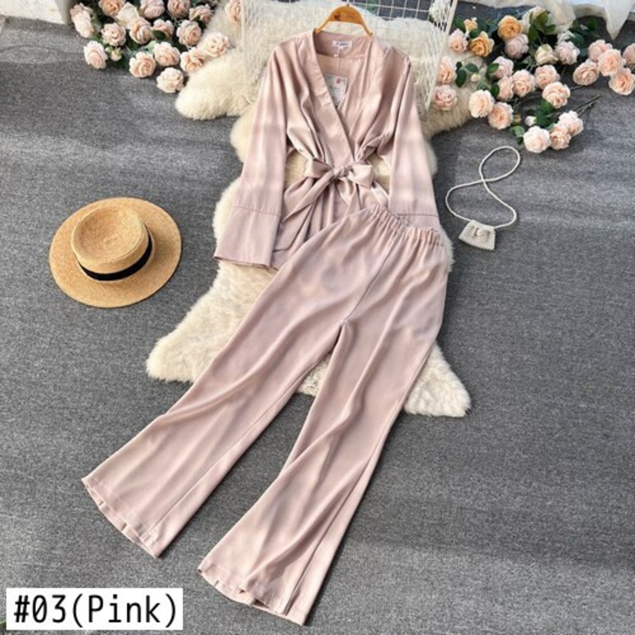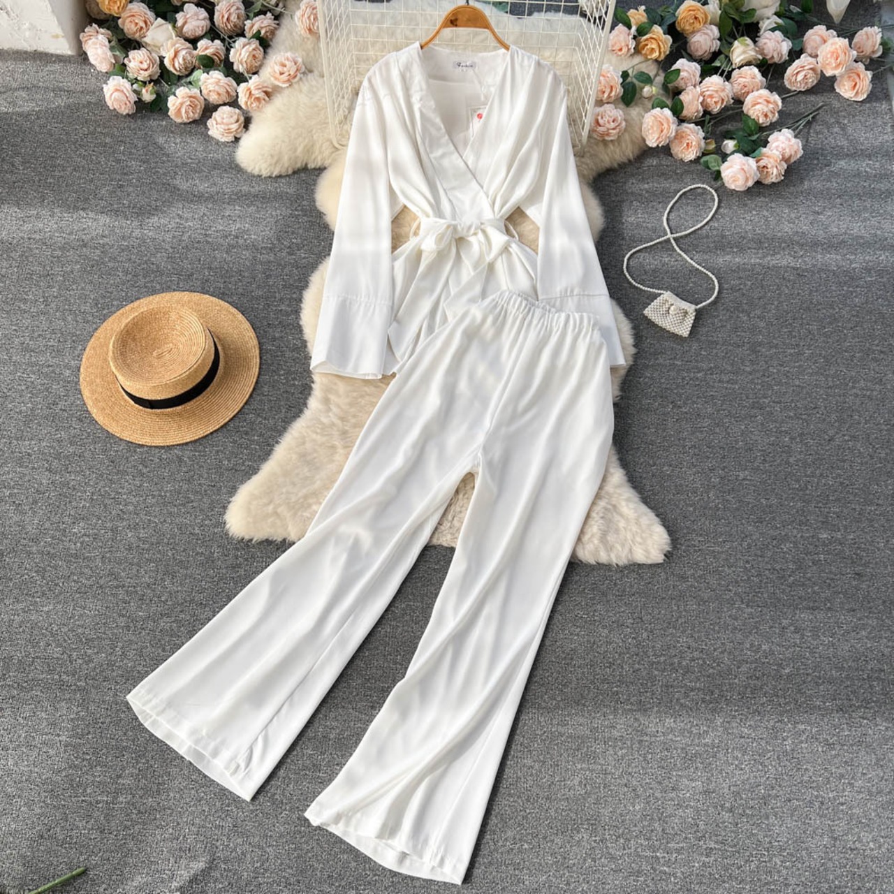 Nomikuma 2 ピース女性春セット弓包帯長袖 V ネックトップス + 弾性ウエストワイドレッグパンツ 2023 衣装 ロング リボン エラスティック 伸縮 スプリング 春物 Vネック ワイドパンツ kor64372958344